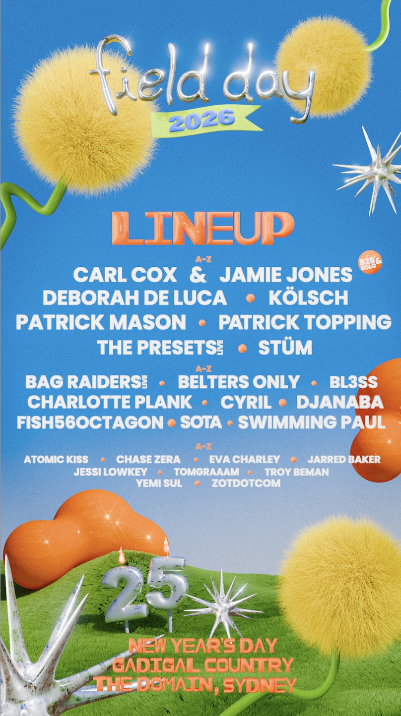 Sydney’s New Year’s Day institution Field Day celebrates 25 years at The Domain in 2026, featuring Carl Cox, Jamie Jones, The Presets, Deborah De Luca and more — plus a new stage dedicated to Sydney’s queer artists.