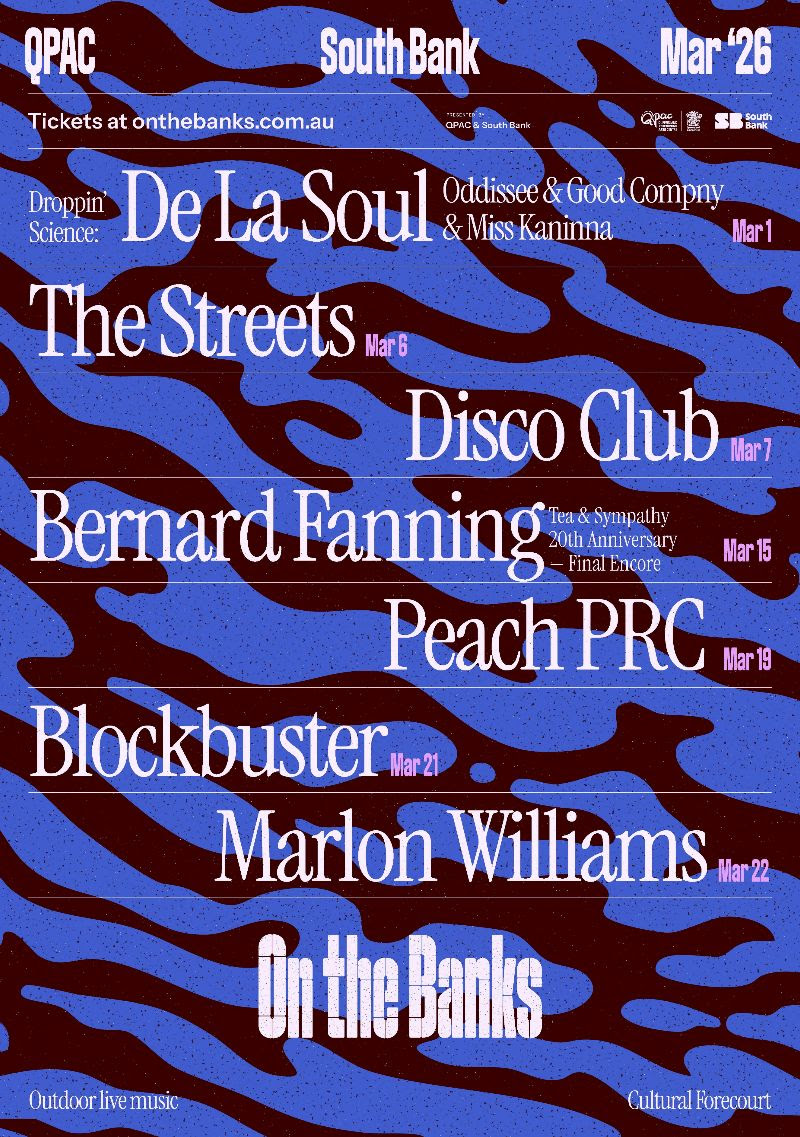 Brisbane’s riverfront will come alive in March 2026 with On the Banks, a new open-air concert series featuring The Streets, De La Soul, Bernard Fanning, Peach PRC, and more — a landmark moment for the city’s live music scene.