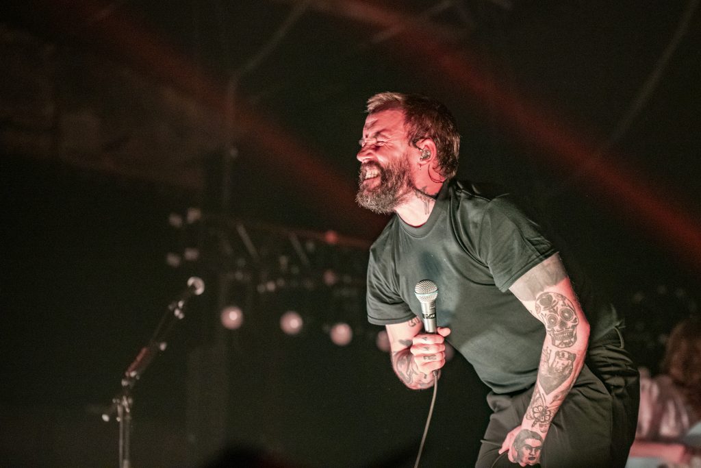 Mother precipitates a rush from the bar and several sweaty casualties slip their way out the mosh for a breather. Crawl is followed by the first appearance off the debut Brutalism album in the shape of Divide And Conquer and the pace drops again and then slows to a crawl through The Beachland Ballroom, which actually sounds ok live. It’s stomping time as the opening riff of Never Fight A Man With A Perm, complete with the stolen Nancy Sinatra refrain. Sadly, the irony is lost on some of those present tonight. Despite all the “look after each other” rhetoric and platitudes coming from the stage, there are pockets of aggression throughout. Reminds me of some of the Hardcore shows I frequented back in the day, except alcohol rarely played a part in those! New Sensation, another Crawler track, reminds me of Do The Supernova by John Robb’s Membranes, with it’s heavy bass driven beat and simple percussion. 1049 Gotho is followed in quick succession by the gothic sounding When The Lights Come On and Love Song, which musically isn’t far removed from Bauhaus. Joe announces the arrival of the Stump sounding The Wheel, as a song about alcoholism and heads nod furiously in time, “can I get a hallelujah”!