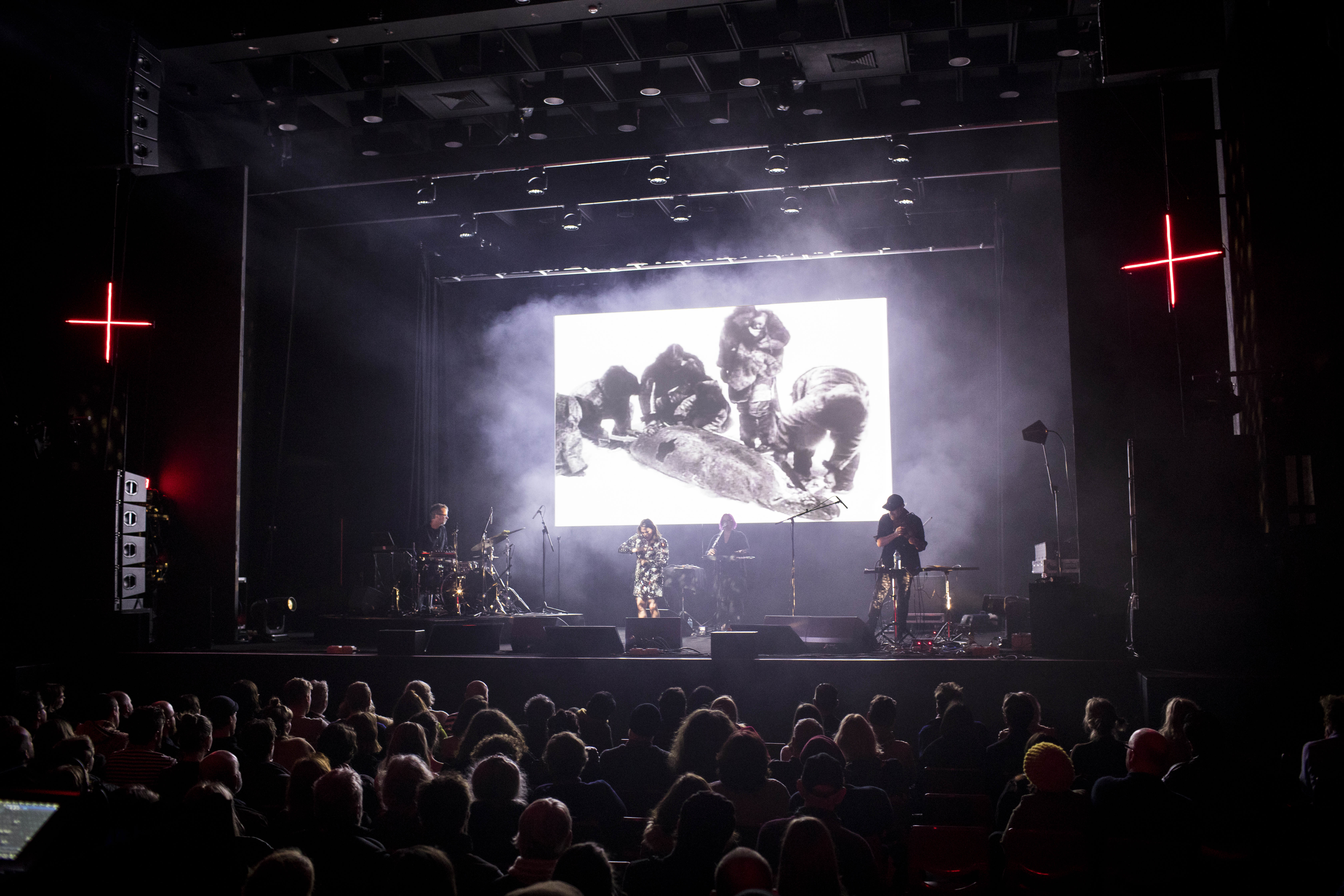 As fascinating as the film is, it is hard not to be mesmerised by Tagaq’s performance and the extraordinary talent of her band. Her voice is transcendent – it rumbles from the depths like a singer from a Norwegian death metal band, it soars like an opera singer and sometime chatters and sometimes laughs. The expressive delivery of the voice is matched by her physical performance – her hands, her fingers stretch and ripple, her body sways and her eyes sometimes closed in concentration and sometimes sparkle and entice. It is utterly mesmerising.