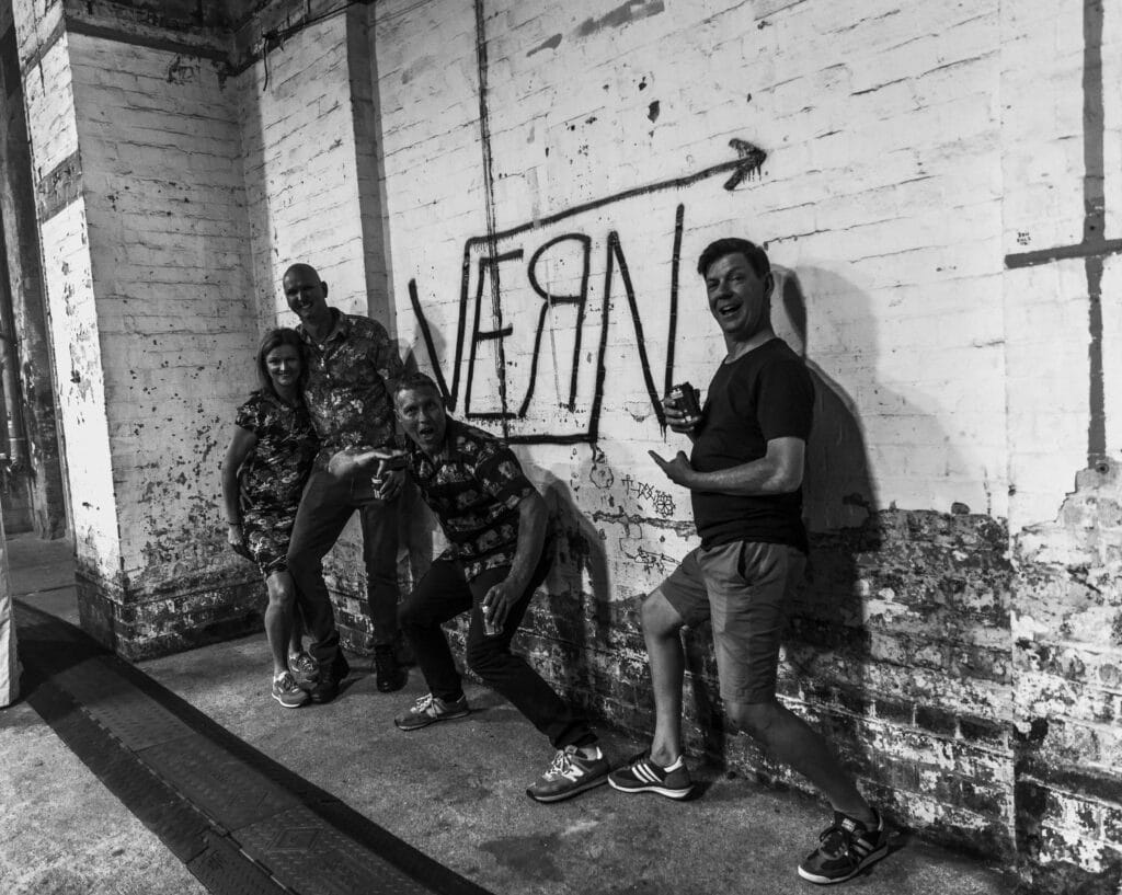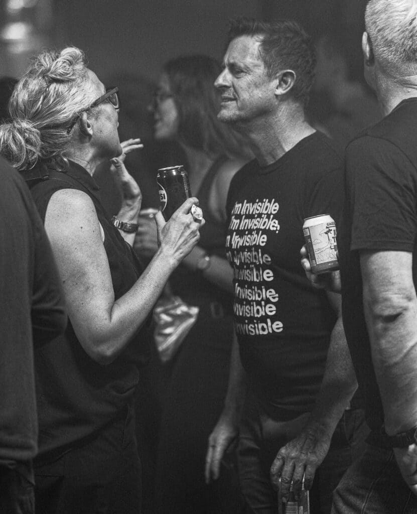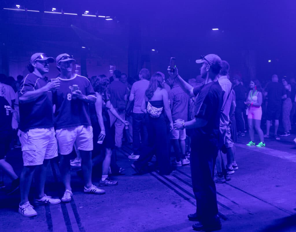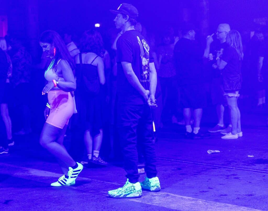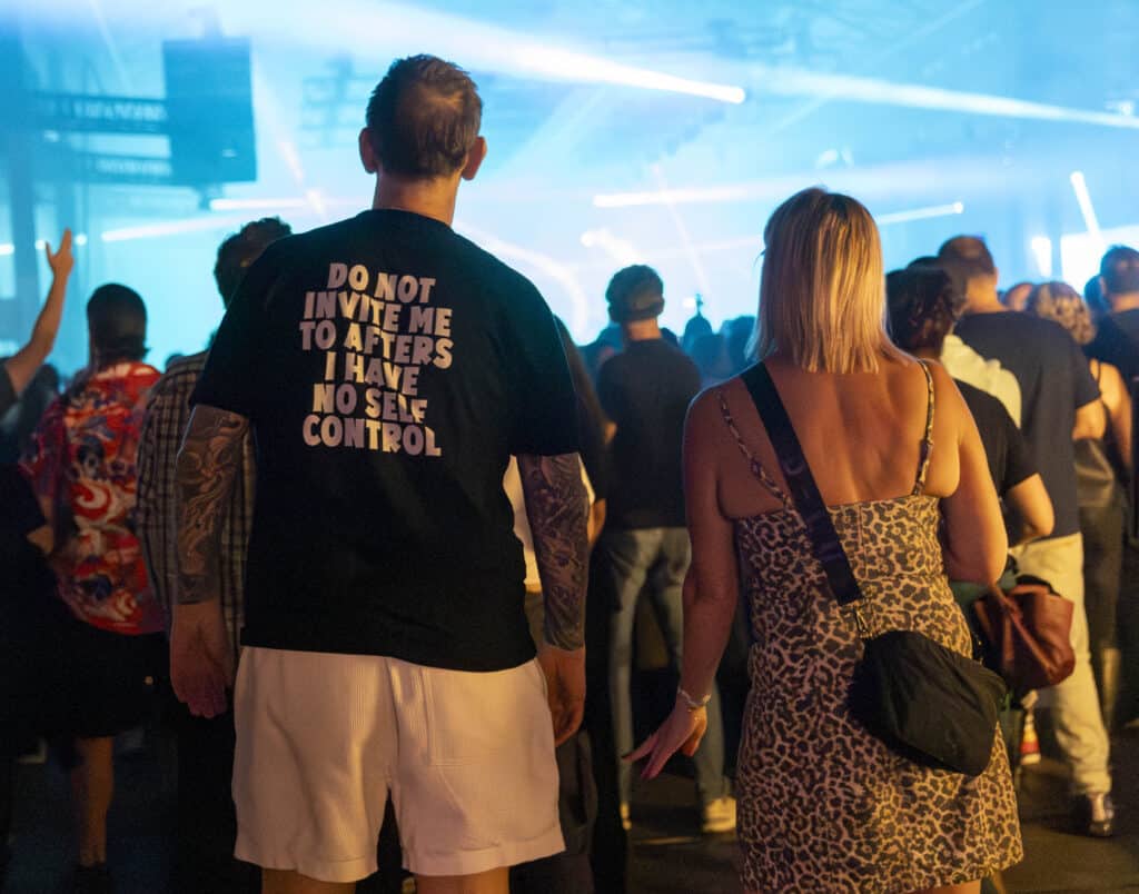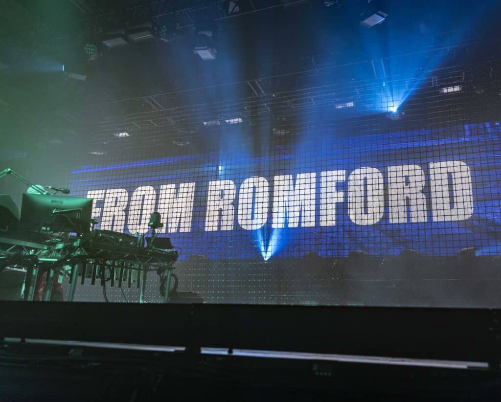 Karl Hyde and Rick Smith remain mostly obscured behind towering screens and equipment, surfacing only occasionally, dancing briefly into view before dissolving back into the machinery. Photographing them proves difficult, but it almost feels beside the point. Underworld’s presence has never been about visibility so much as immersion, and the crowd fills in the rest. From the man wearing a shirt that reads “I am invisible,” to Vern posing proudly beside graffiti bearing his name, to a dancer in luminous clothes and a yoyo spinning arcs of light, the audience becomes part of the spectacle.