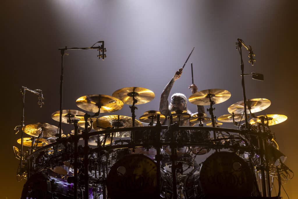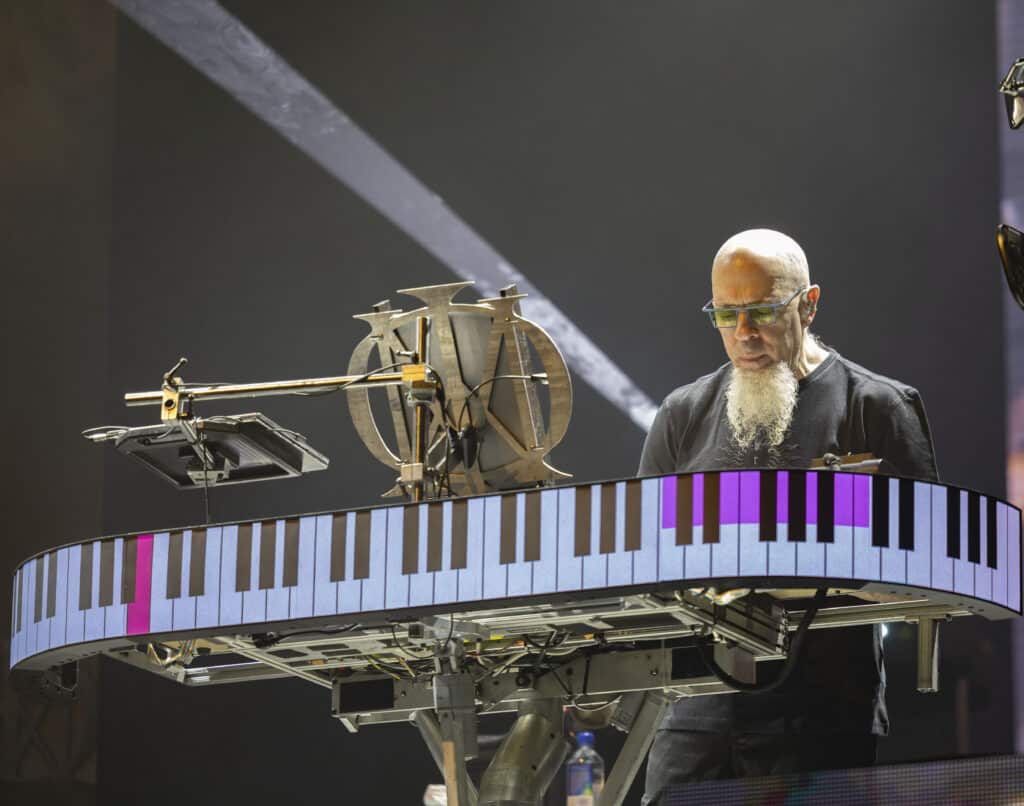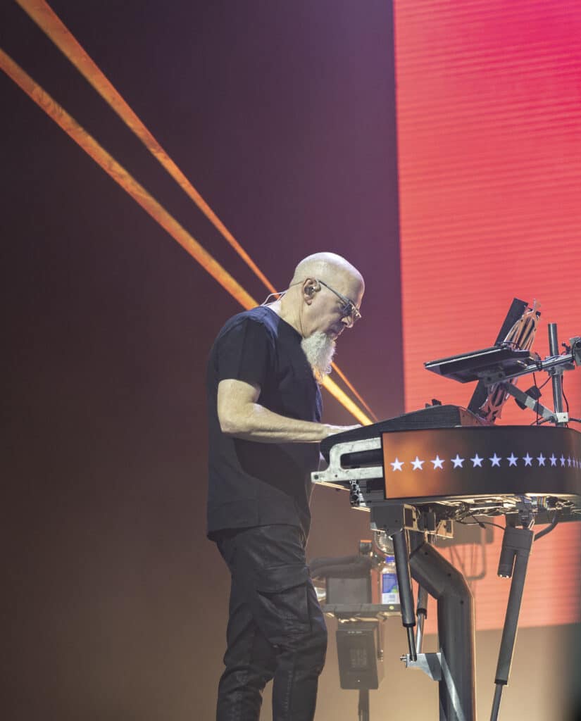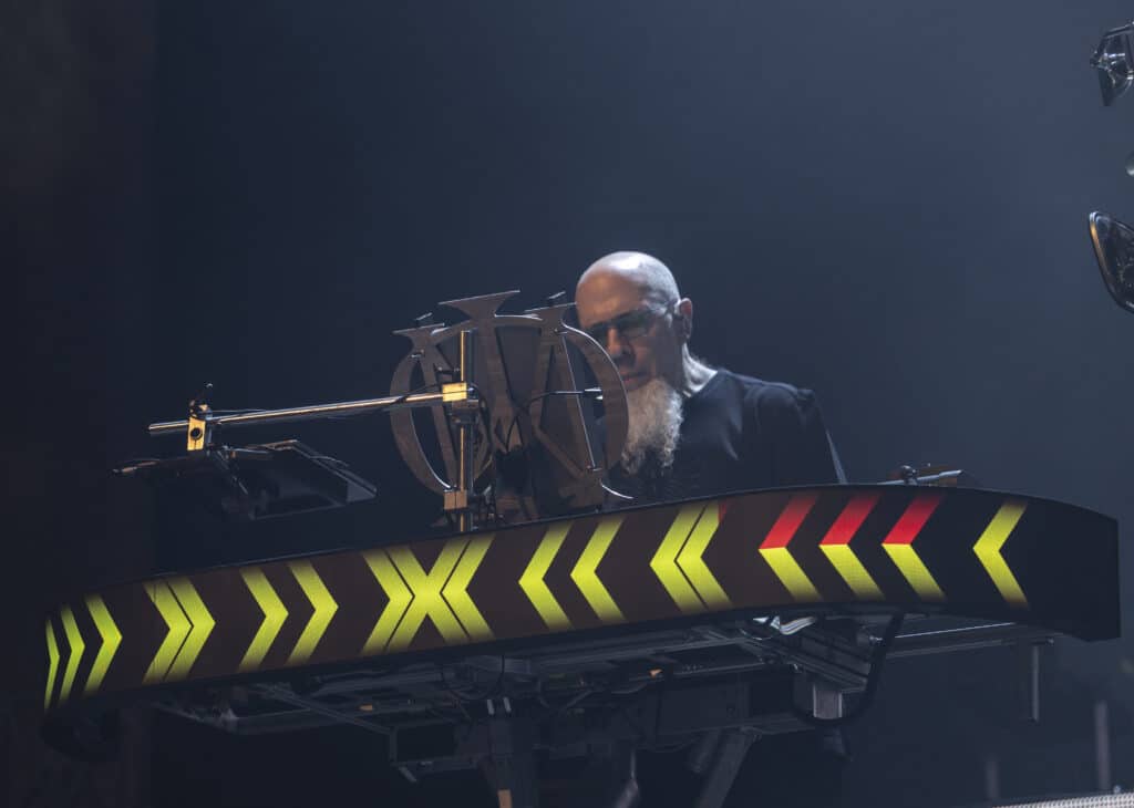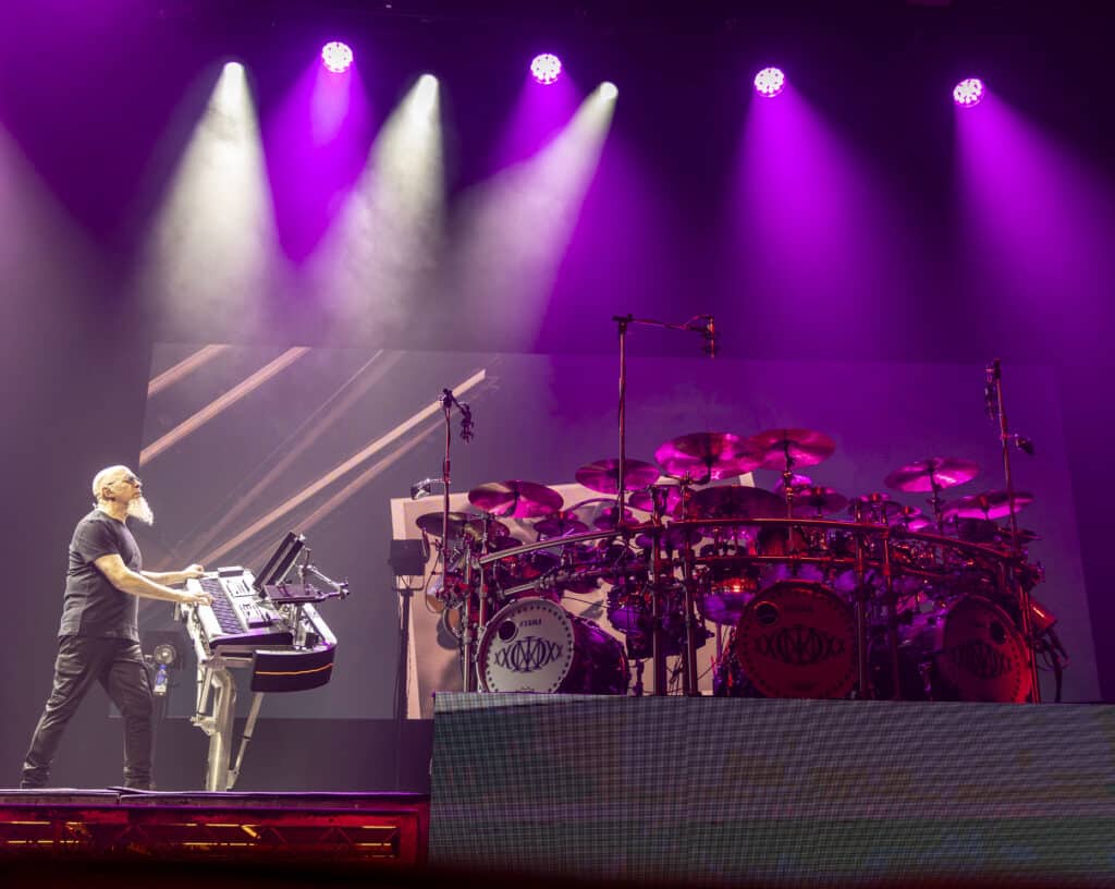 After the curtain drops, James LaBrie reappears almost theatrically, stalking the lip of the stage before retreating during the band’s extended instrumental passages. Behind him, Mike Portnoy sits ensconced within one of the most formidable drum kits to grace the ICC Theatre, a gleaming fortress of cymbals and toms from which he occasionally peers out, commanding the room with measured force. To his right, Jordan Rudess operates a keyboard rig that feels architectural in scale, it tilts and is illuminated by shifting projections on a screen that wraps around the instrument itself. John Myung remains the quiet axis at centre stage, his bass lines steady and exacting, while John Petrucci, composed and precise, threads intricate leads through the mix with the assurance of someone who has spent four decades refining the language.