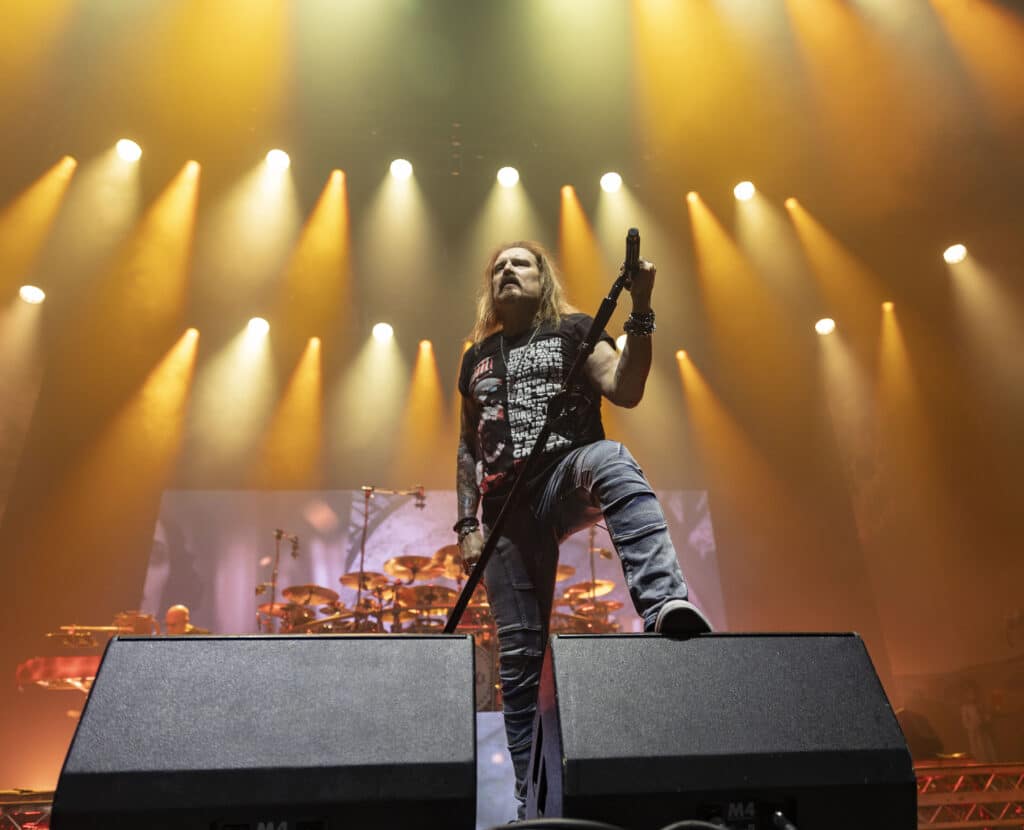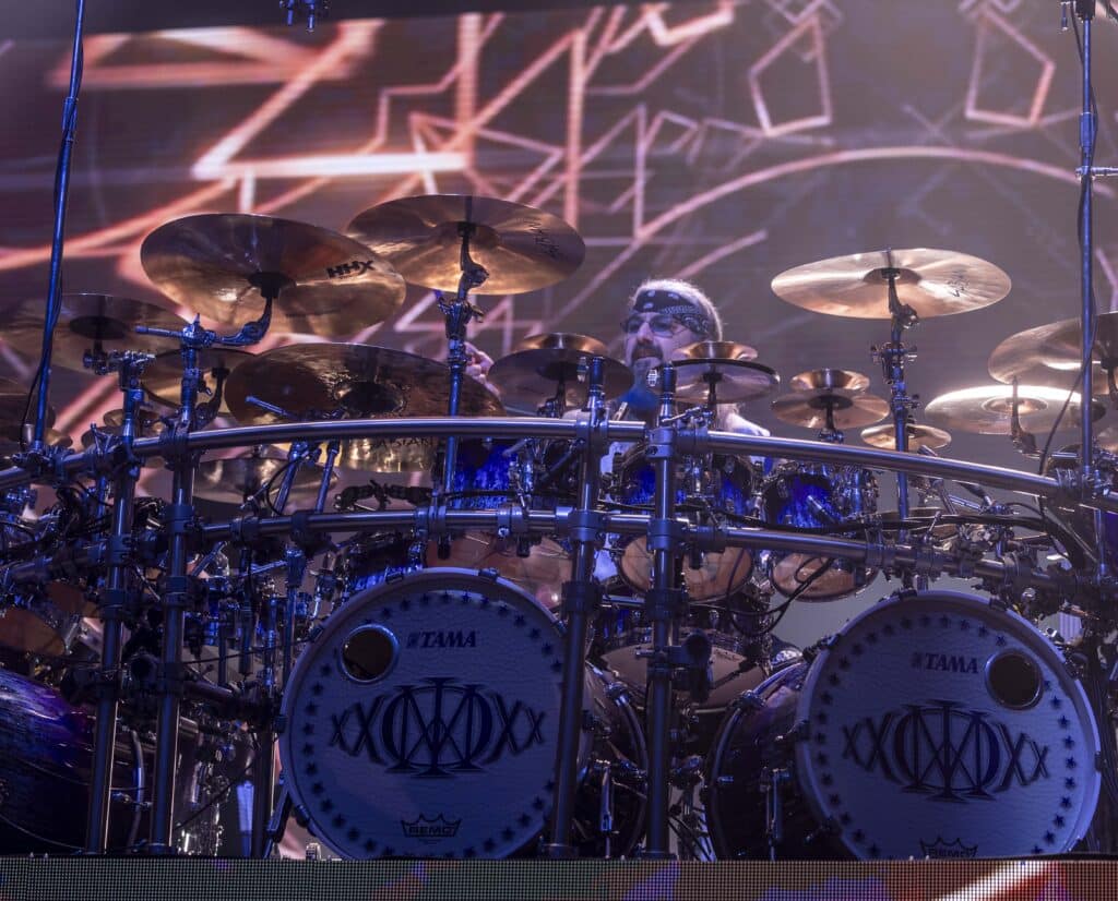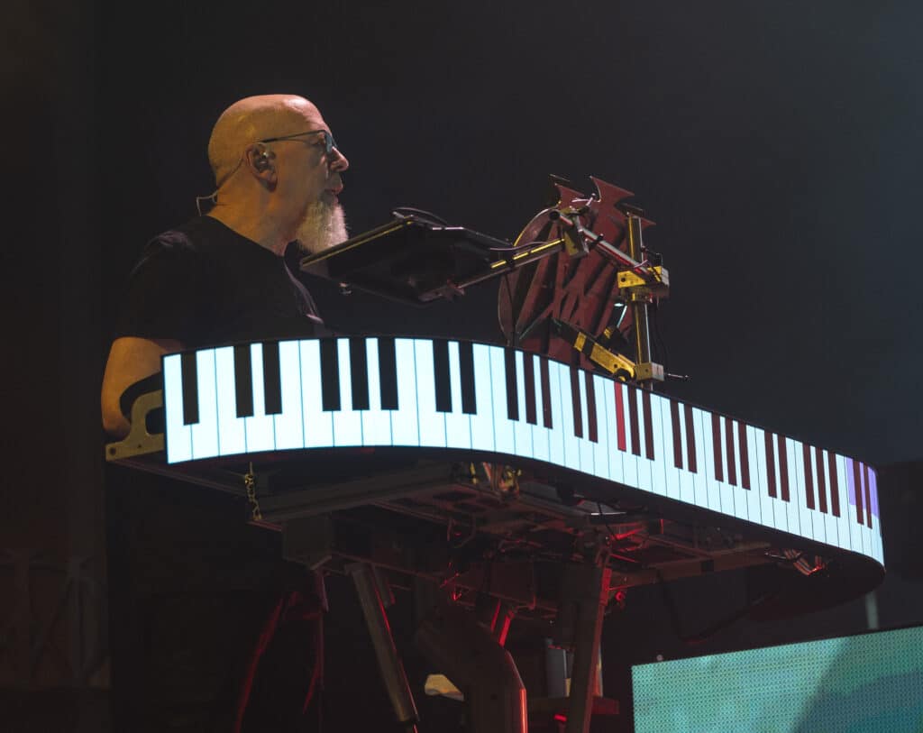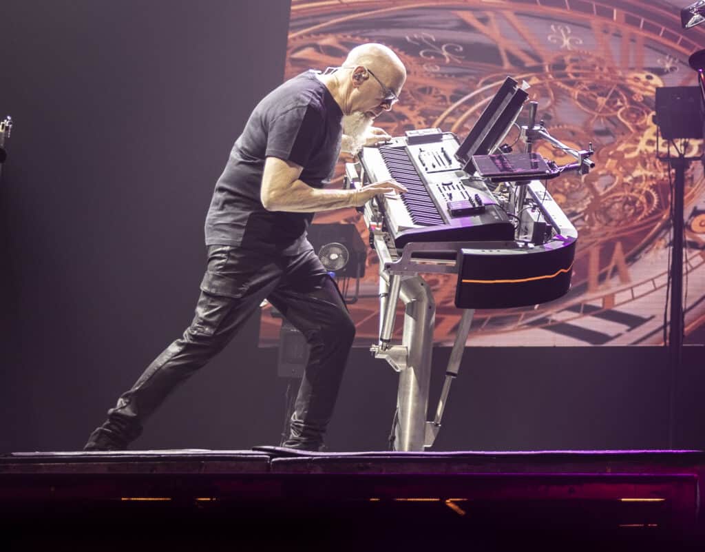 After the curtain drops, James LaBrie reappears almost theatrically, stalking the lip of the stage before retreating during the band’s extended instrumental passages. Behind him, Mike Portnoy sits ensconced within one of the most formidable drum kits to grace the ICC Theatre, a gleaming fortress of cymbals and toms from which he occasionally peers out, commanding the room with measured force. To his right, Jordan Rudess operates a keyboard rig that feels architectural in scale, it tilts and is illuminated by shifting projections on a screen that wraps around the instrument itself. John Myung remains the quiet axis at centre stage, his bass lines steady and exacting, while John Petrucci, composed and precise, threads intricate leads through the mix with the assurance of someone who has spent four decades refining the language.