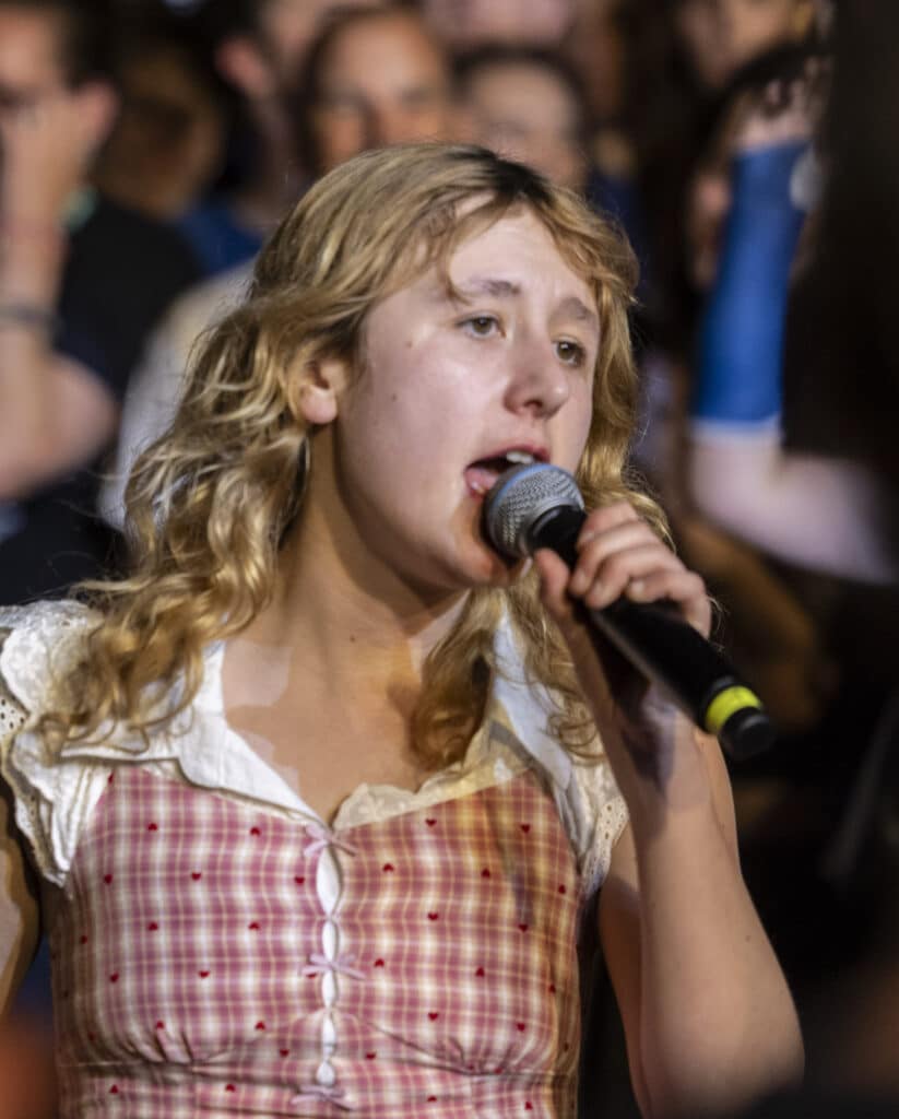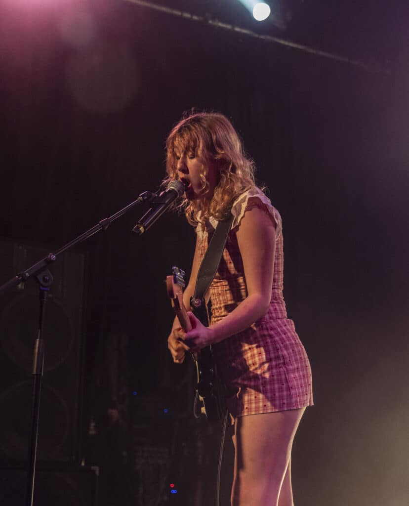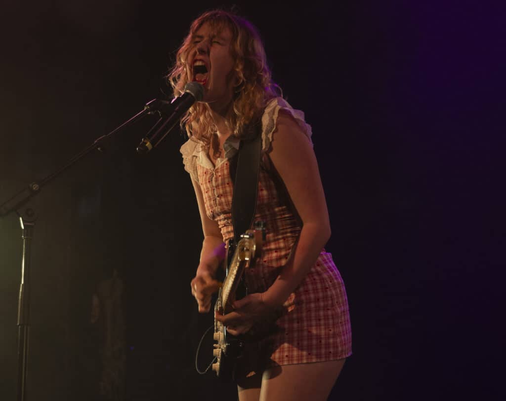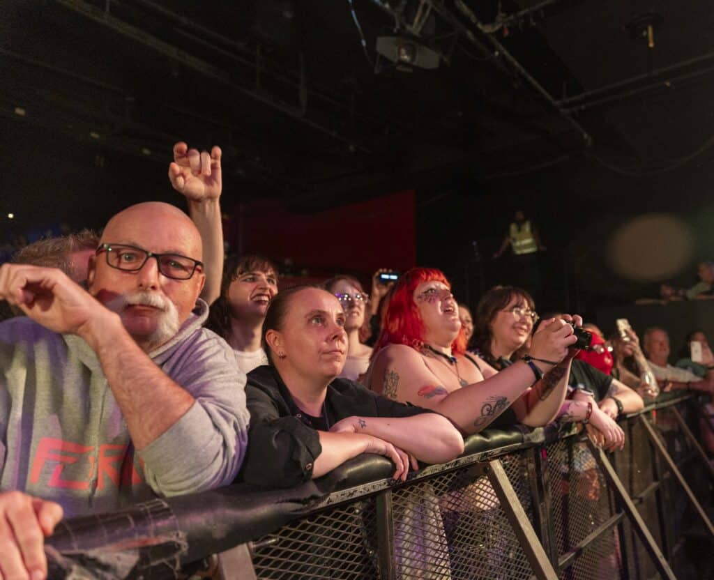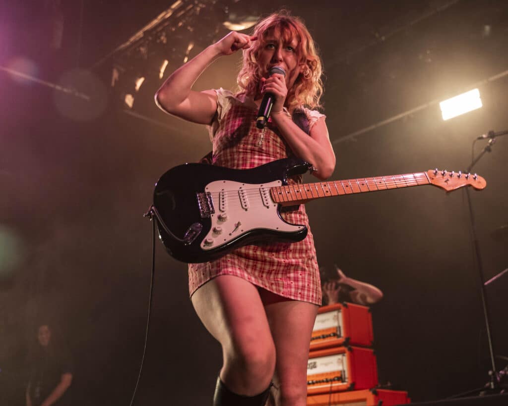 Within the first three songs, Phoebe Lunny has already detonated the invisible border between performer and witness, launching a circle pit into existence like she’s striking flint against bone. She dives into the crowd. She is absolutely fearless, moving through the mass as if she trusts it more than the stage, later clambering up onto one of the balconies and throwing herself back into the heaving organism below. This isn’t performance, it’s surrender to velocity. Suddenly there is no band and no audience, just a single organism convulsing in shared release. Circle pits are starting all over the place. Bodies lift and fall. People scream not because they’re told to, but because something ancient inside them has finally been given permission to speak.