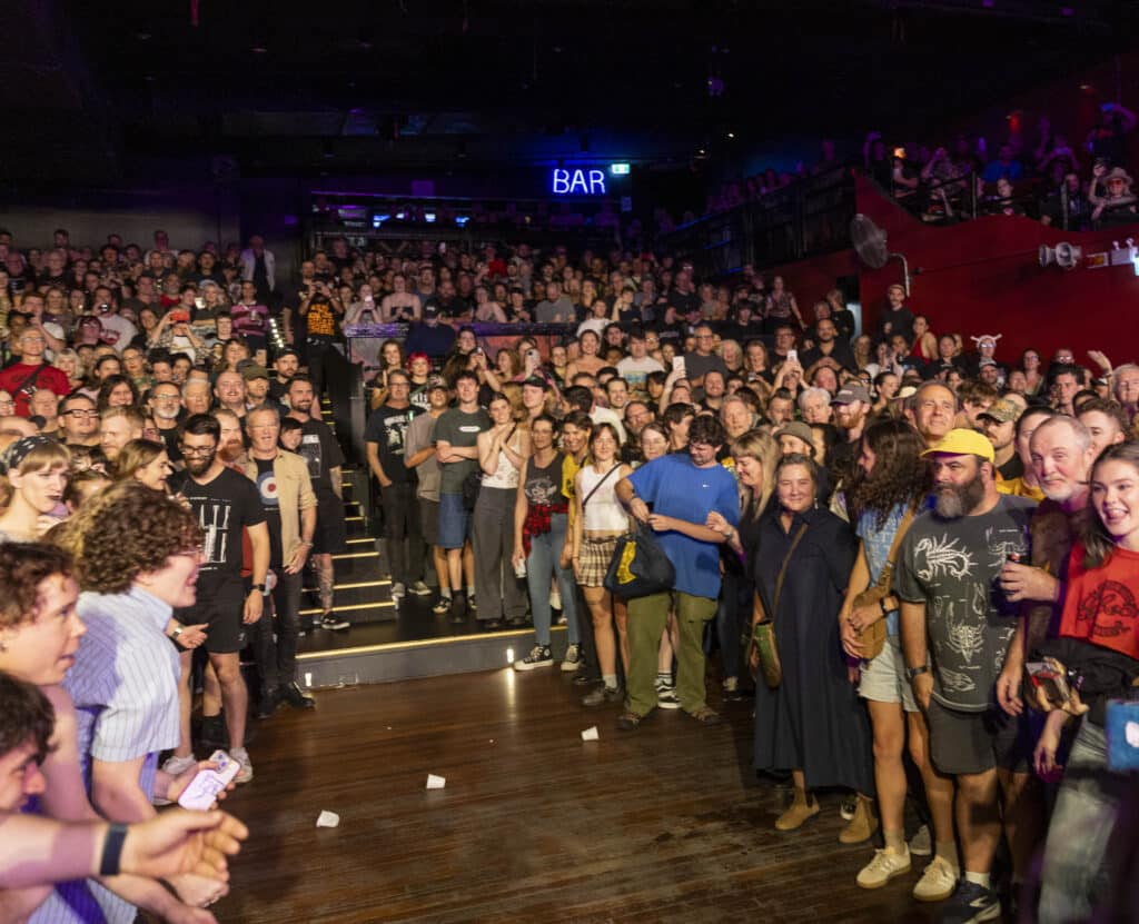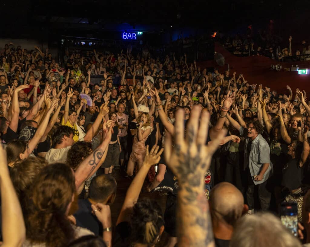 But Lambrini Girls don’t just rupture the physical architecture of the room, they dismantle its moral comfort too. Lunny stalks the fault lines between songs, telling the crowd exactly how much she detests the UK government. She asks whether Anthony Albanese is popular here, and the response comes back immediate and unanimous: “NO.” She leads the room through chants that feel less like slogans and more like ritual incantations: “Always was, always will be Aboriginal land.” “Free, free Palestine.” Later she twists the air itself into call-and-response — “Craig…” “David.” “Lambrini…” “Girls.” “F*ck…” “Fascists.” Each word lands like a hammer strike, forging something communal out of noise and refusal.