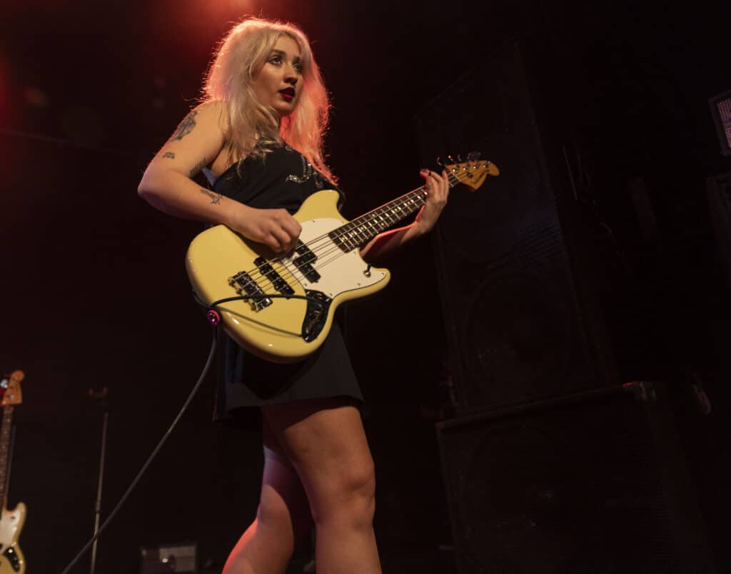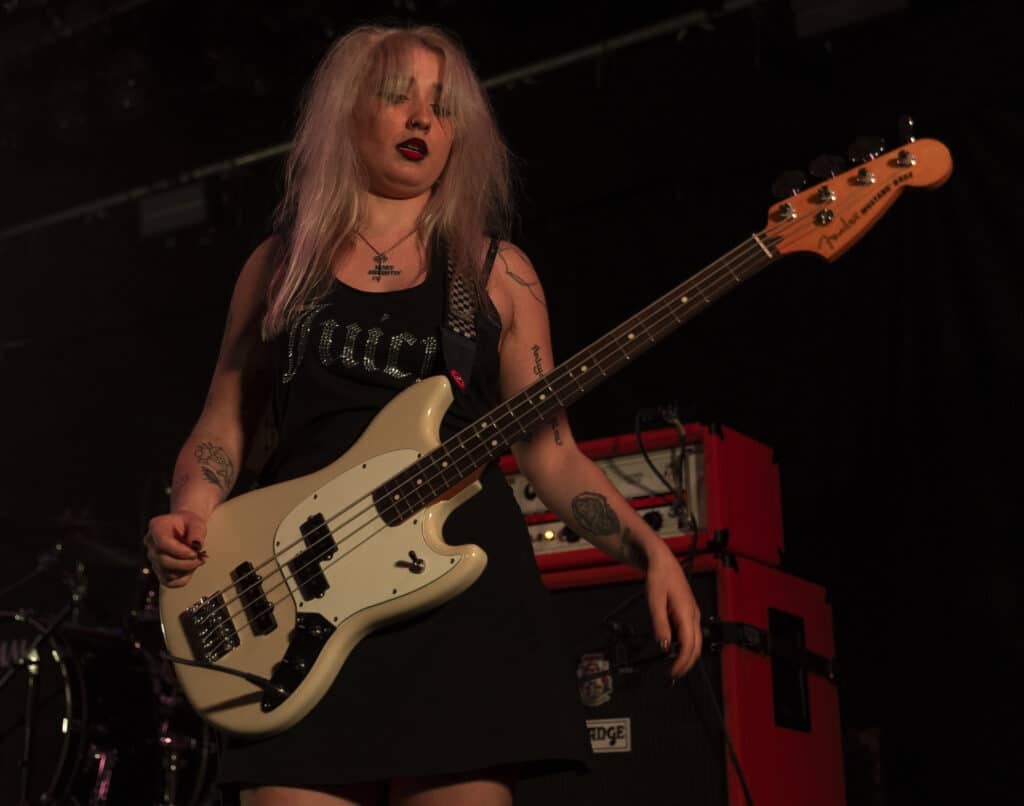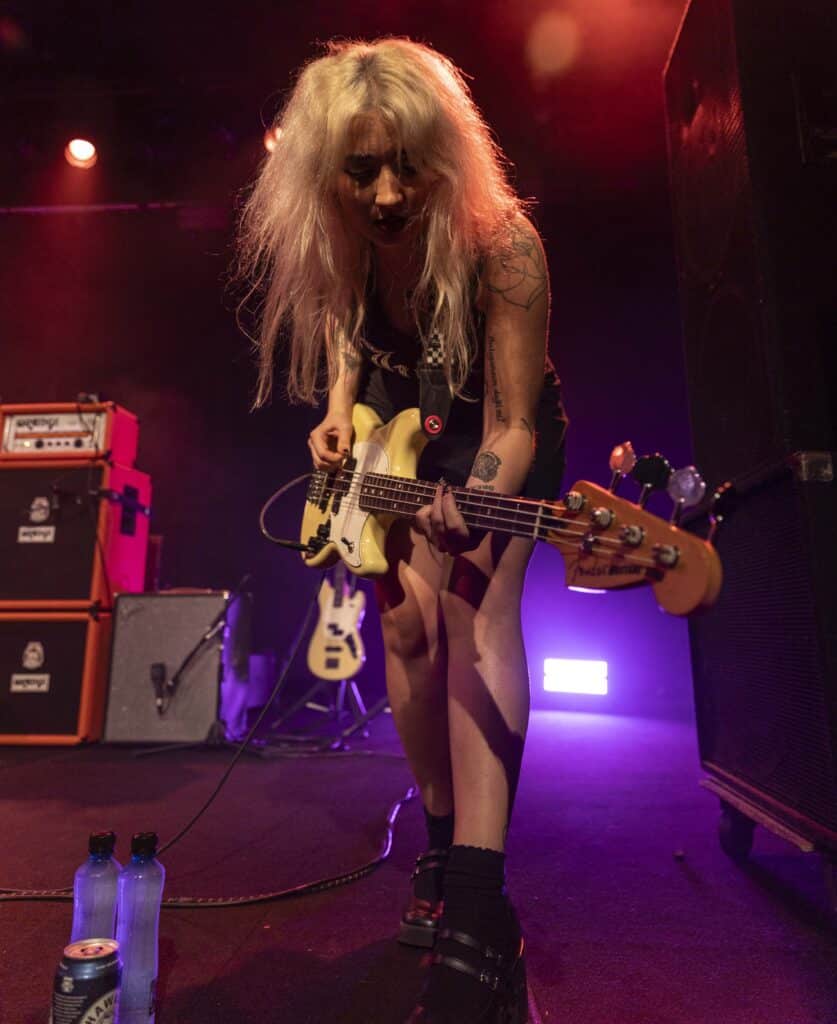 Then Lambrini Girls arrive and the venue prepares for impact. They named themselves after Lambrini, that syrupy, bargain-bin pear cider marketed with a wink and a smirk toward girls who were never meant to be taken seriously, a drink weaponised by culture as shorthand for disposable femininity. But Lambrini Girls aren’t cheap wine, they’re Molotov cocktails. If you were expecting something sweet and ignorable, you’d be wrong, instead you get ignition.