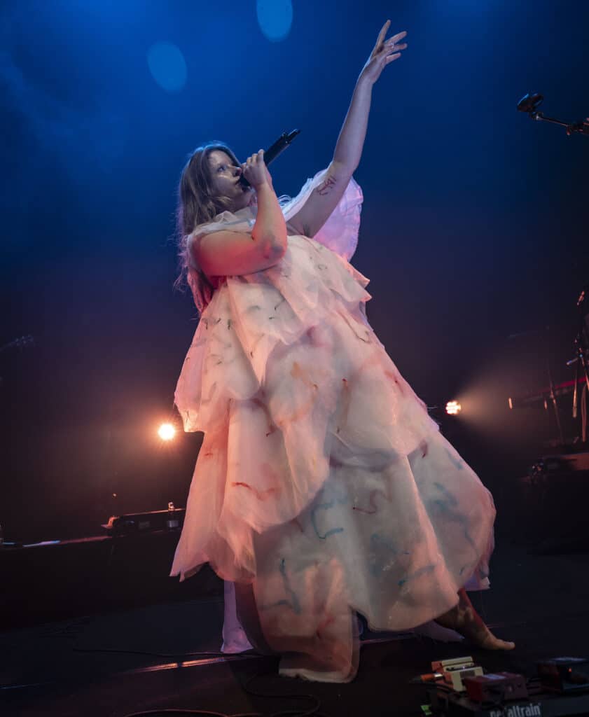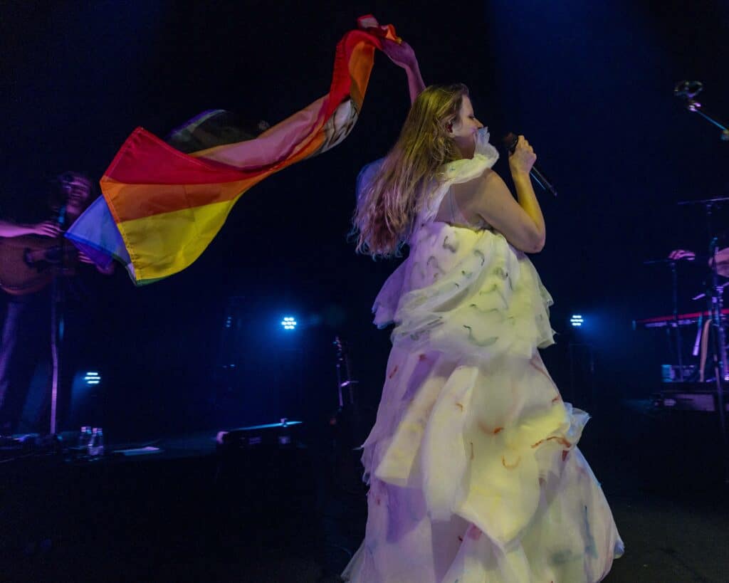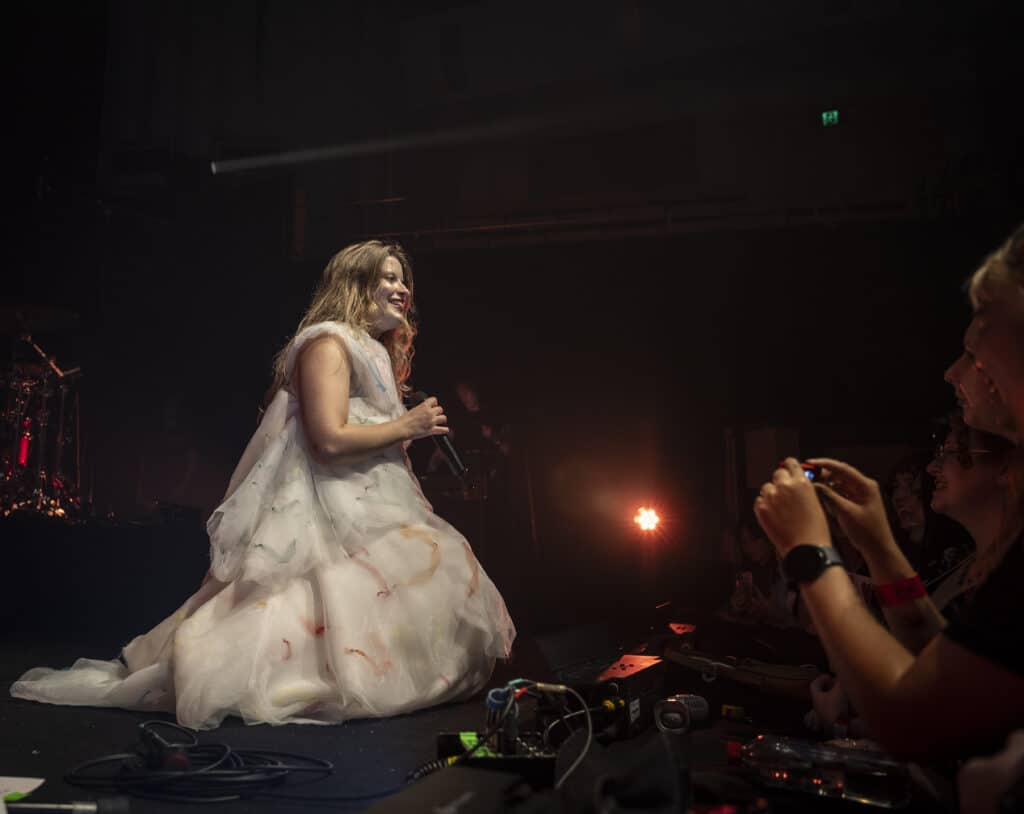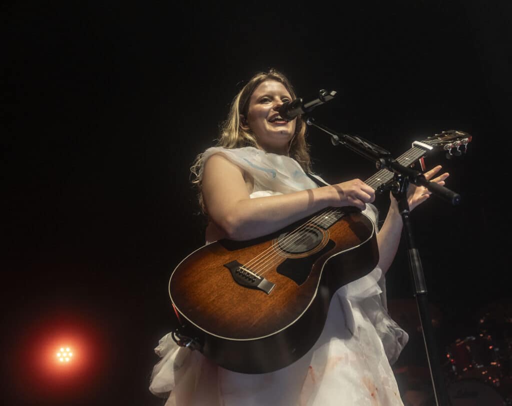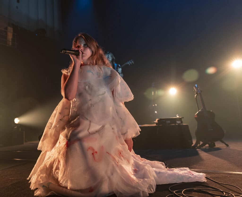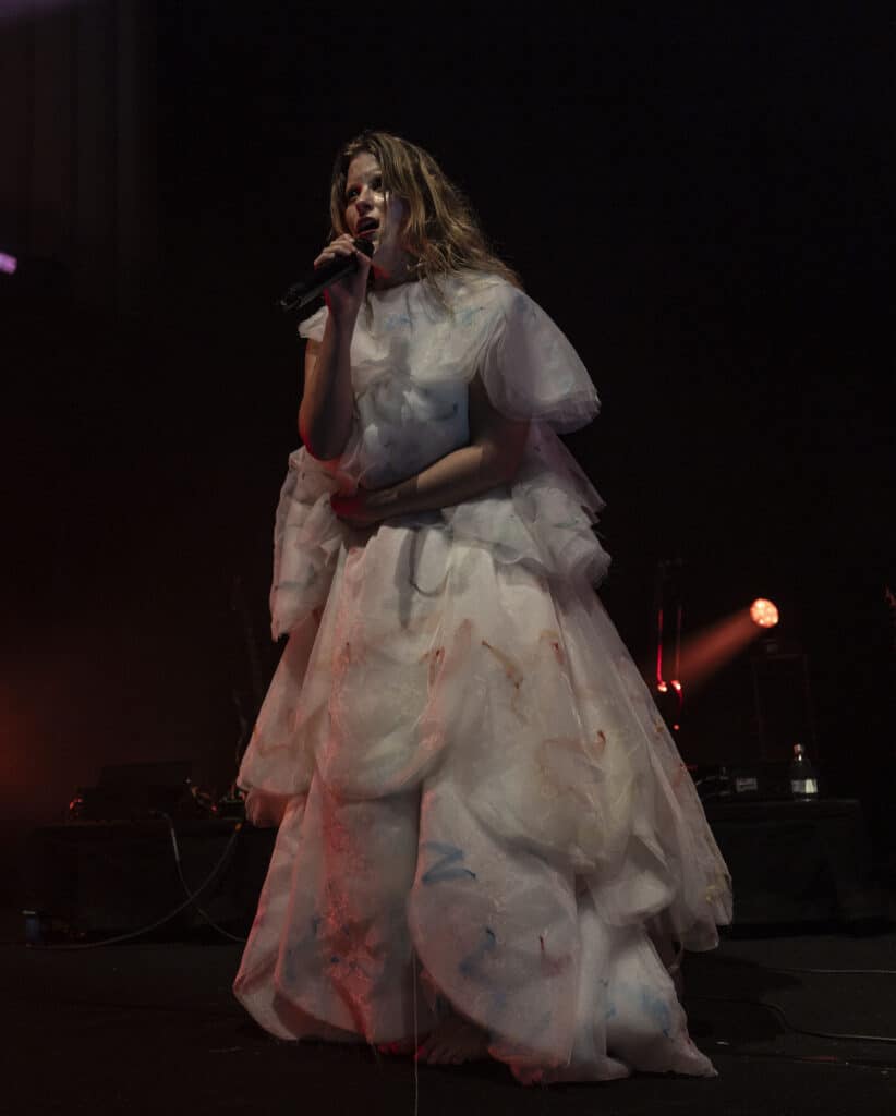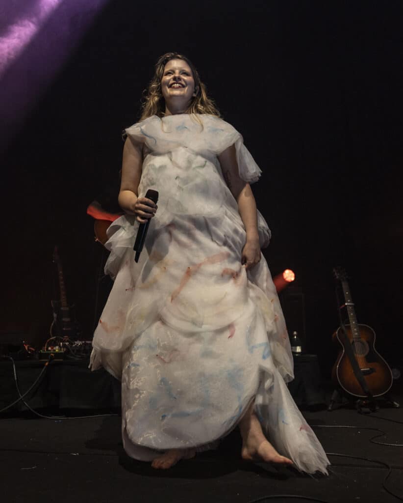 Paloma steps onstage in a flowing white gown that holds the light, her physical presence reinforcing the political intent threaded through her songs. During the second song of the set, she accepts a pride flag from an audience member before addressing the crowd directly, speaking about the patriarchy and quoting the headline of a recent essay by Rebecca Shaw: I knew one day I’d have to watch powerful men burn the world down – I just didn’t expect them to be such losers, as she launches into ‘Good Boy.’ The moment lands not as provocation, but as context, framing the performance within the same cultural conversations her music already occupies.