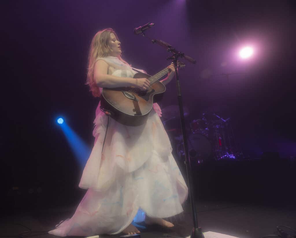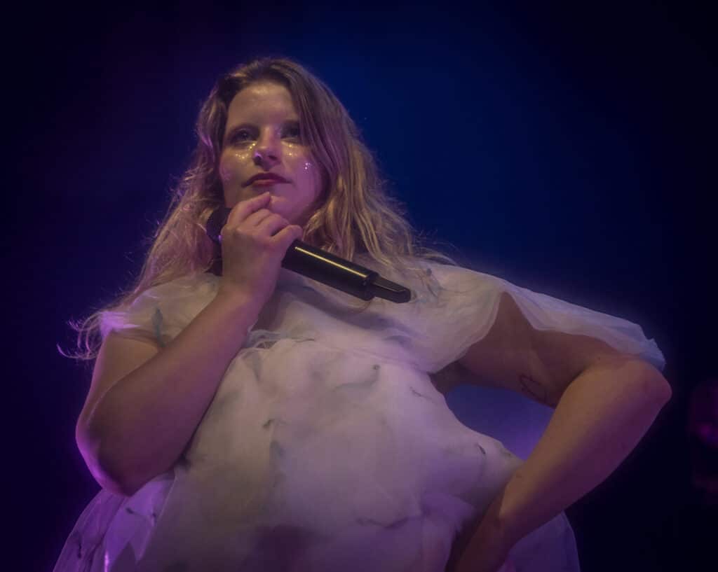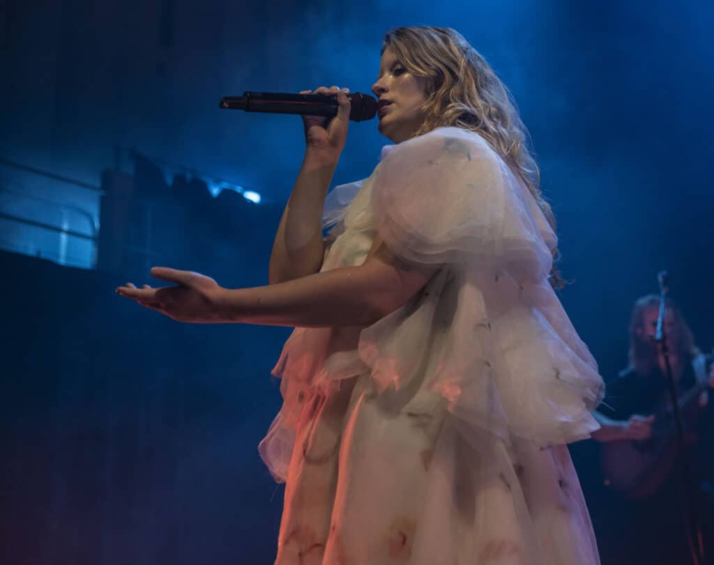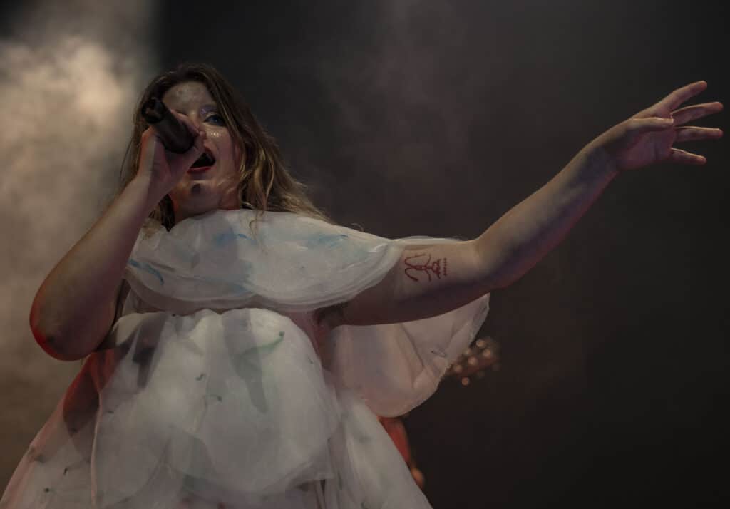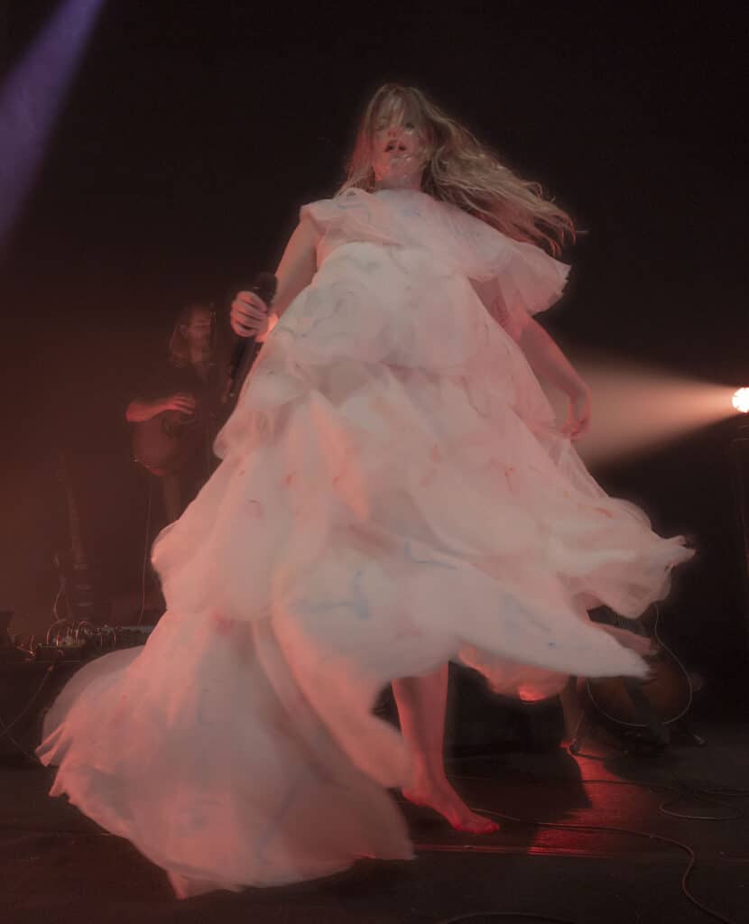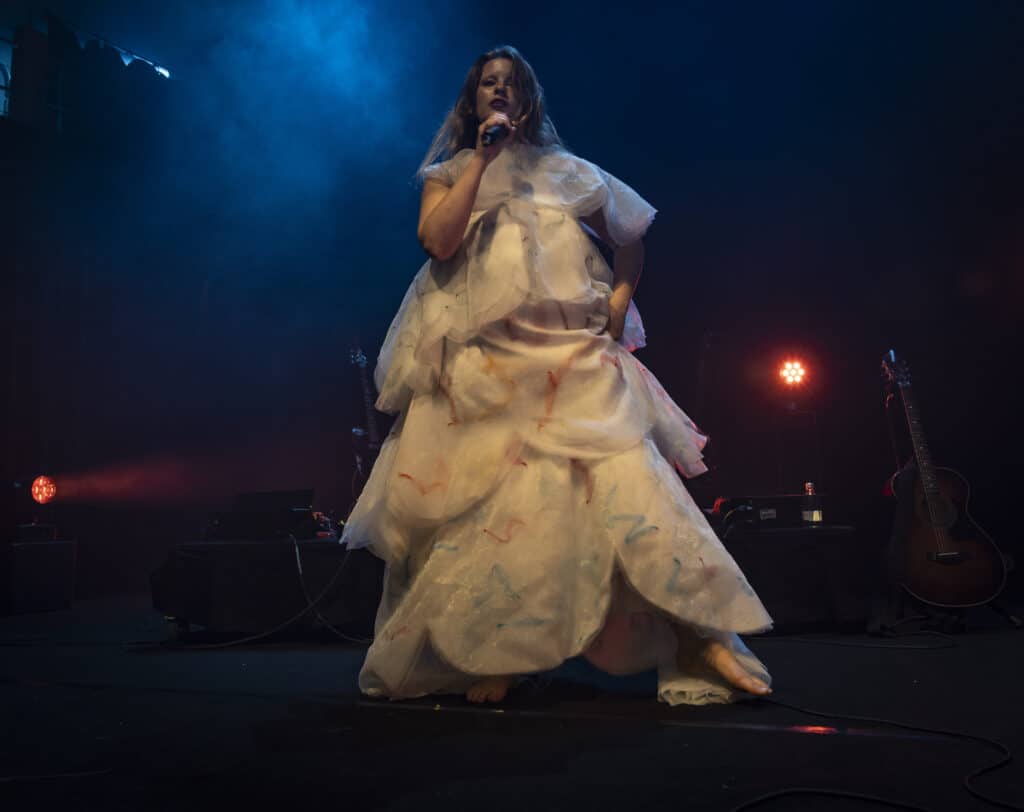 Paloma steps onstage in a flowing white gown that holds the light, her physical presence reinforcing the political intent threaded through her songs. During the second song of the set, she accepts a pride flag from an audience member before addressing the crowd directly, speaking about the patriarchy and quoting the headline of a recent essay by Rebecca Shaw: I knew one day I’d have to watch powerful men burn the world down – I just didn’t expect them to be such losers, as she launches into ‘Good Boy.’ The moment lands not as provocation, but as context, framing the performance within the same cultural conversations her music already occupies.