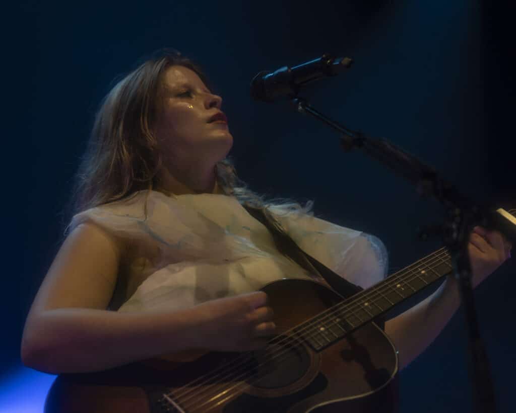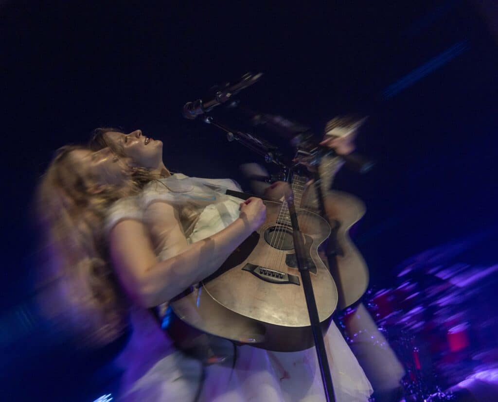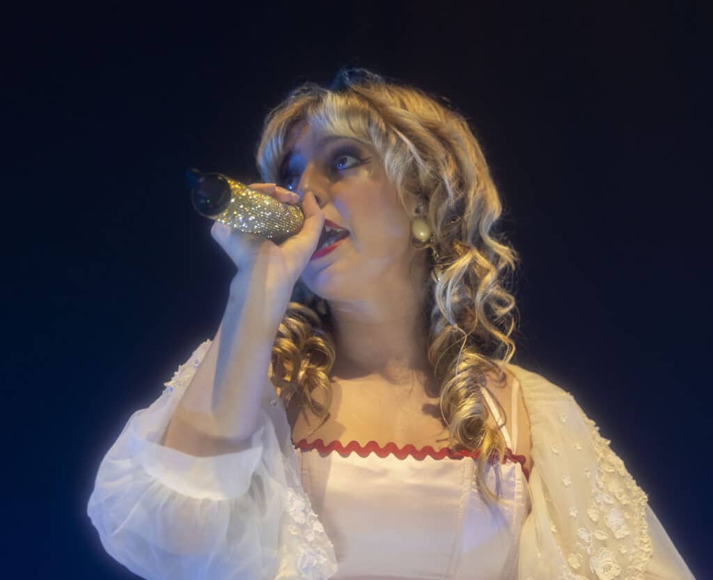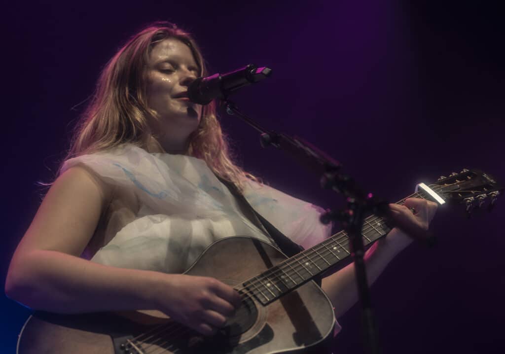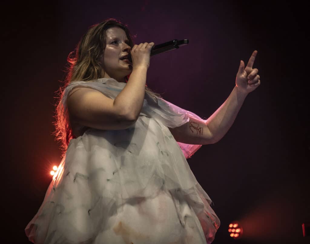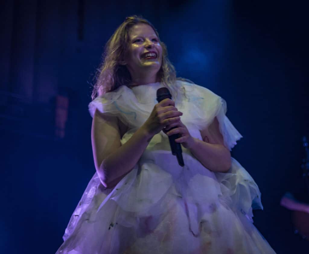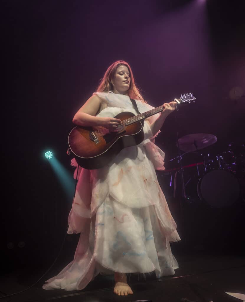 Paloma steps onstage in a flowing white gown that holds the light, her physical presence reinforcing the political intent threaded through her songs. During the second song of the set, she accepts a pride flag from an audience member before addressing the crowd directly, speaking about the patriarchy and quoting the headline of a recent essay by Rebecca Shaw: I knew one day I’d have to watch powerful men burn the world down – I just didn’t expect them to be such losers, as she launches into ‘Good Boy.’ The moment lands not as provocation, but as context, framing the performance within the same cultural conversations her music already occupies.