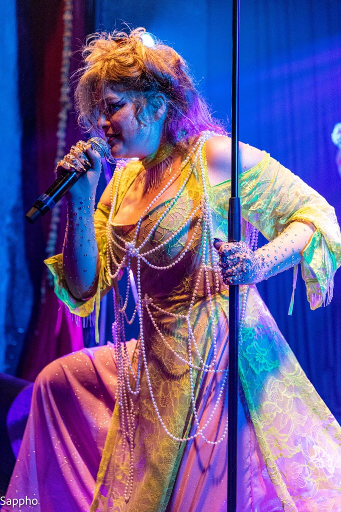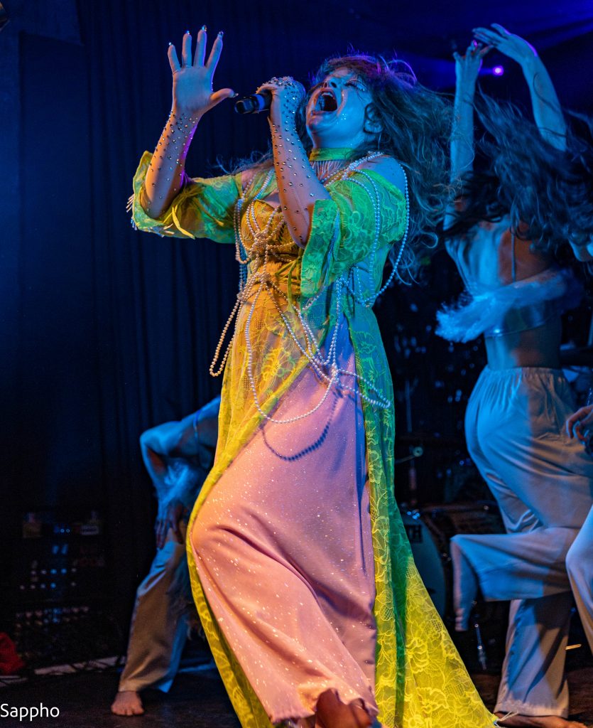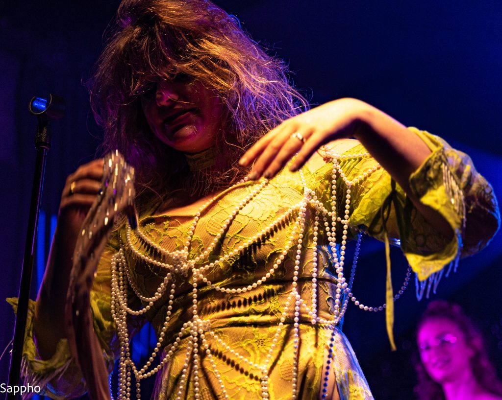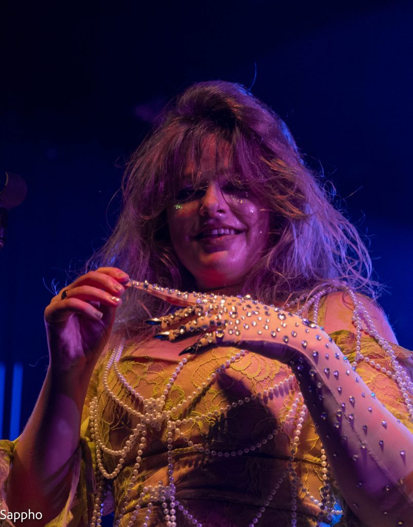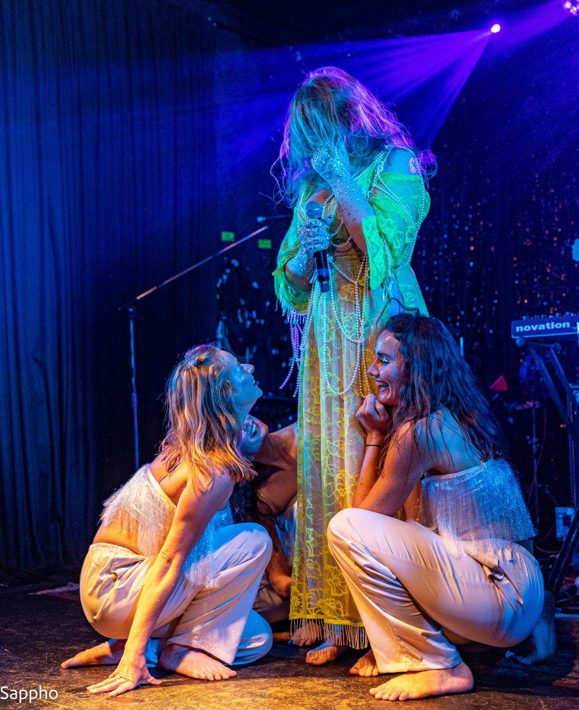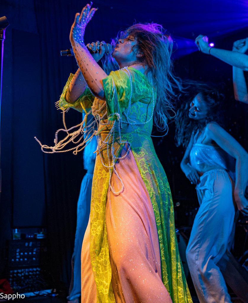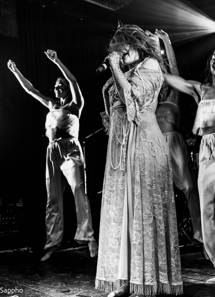 Sappho entranced the audience at the Vanguard with her show last night. Part Kate Bush, part Madonna, she hit the stage with a cover of Jamiroquai’s Cosmic Girl. Backed by four vocalists who also joined in as dancers, it was all swinging pearls and dancing girls as Sappho dazzled the crowd with her funky, upbeat pop.