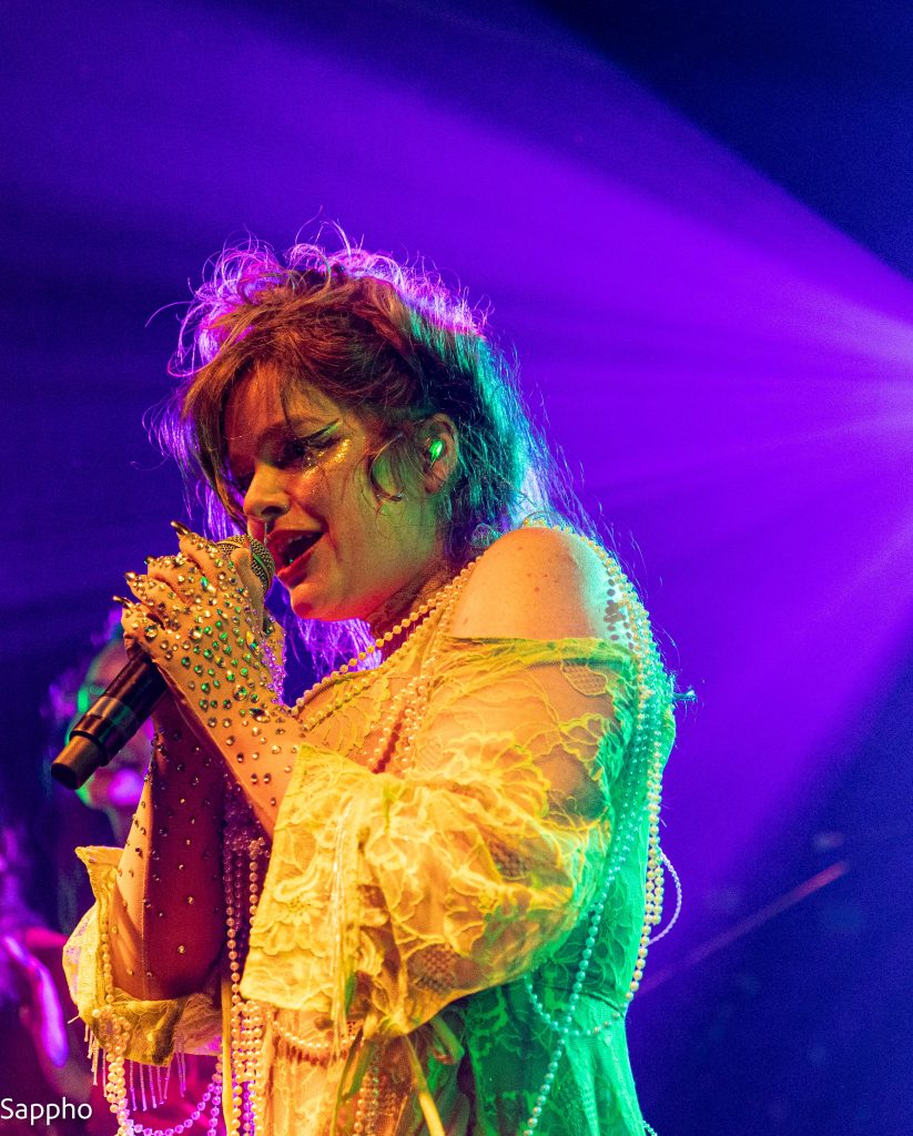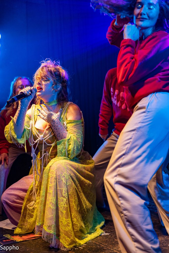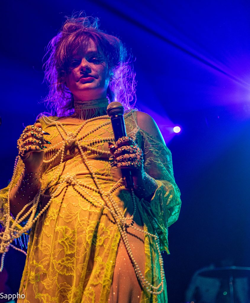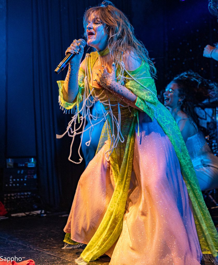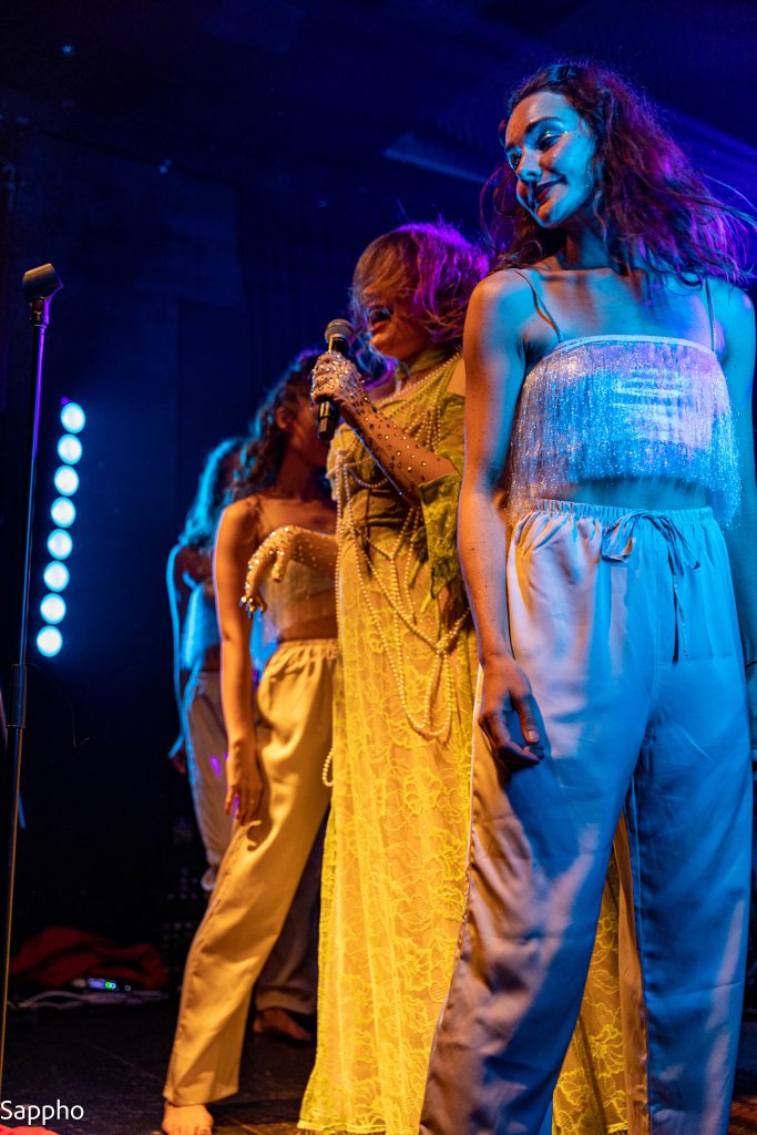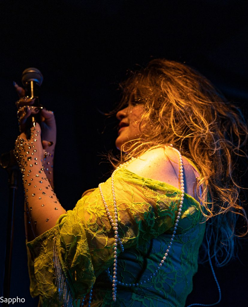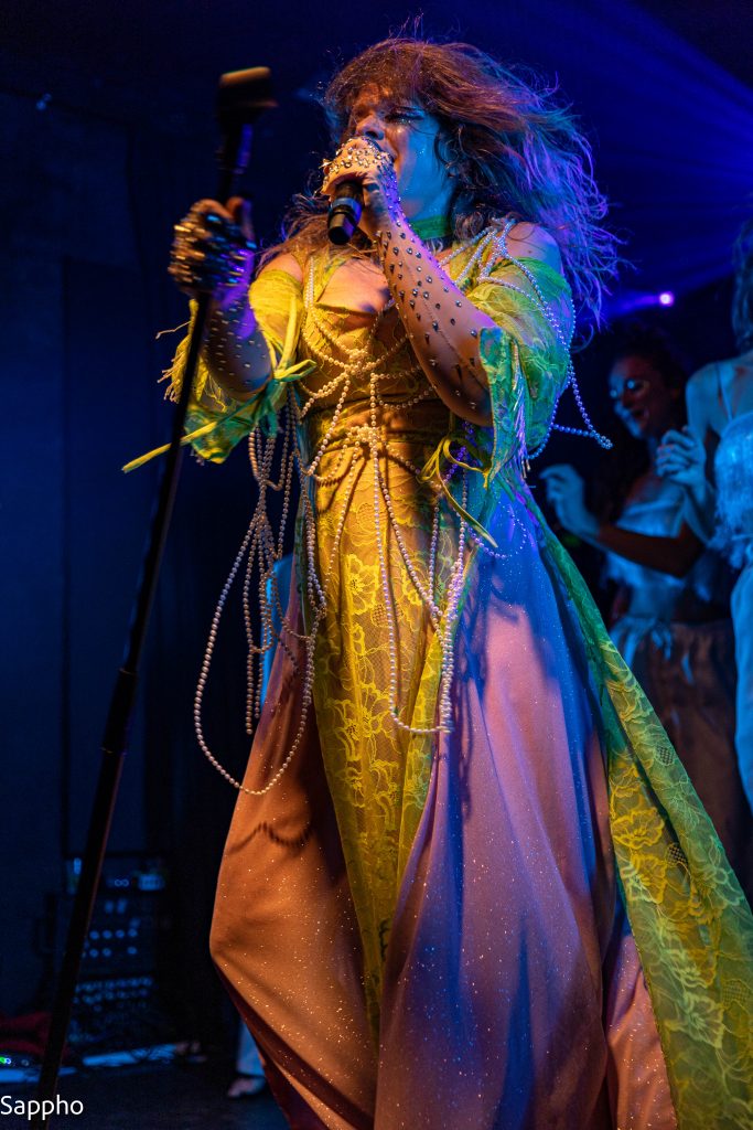 Sappho entranced the audience at the Vanguard with her show last night. Part Kate Bush, part Madonna, she hit the stage with a cover of Jamiroquai’s Cosmic Girl. Backed by four vocalists who also joined in as dancers, it was all swinging pearls and dancing girls as Sappho dazzled the crowd with her funky, upbeat pop.