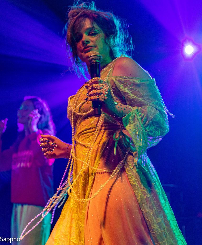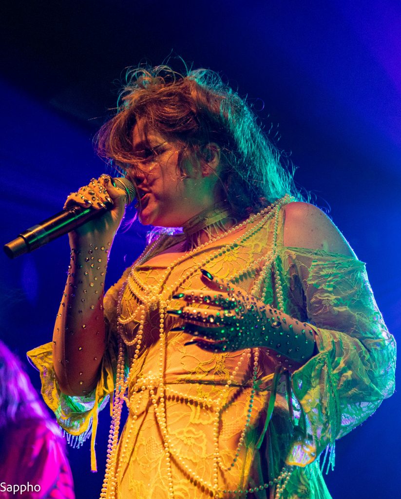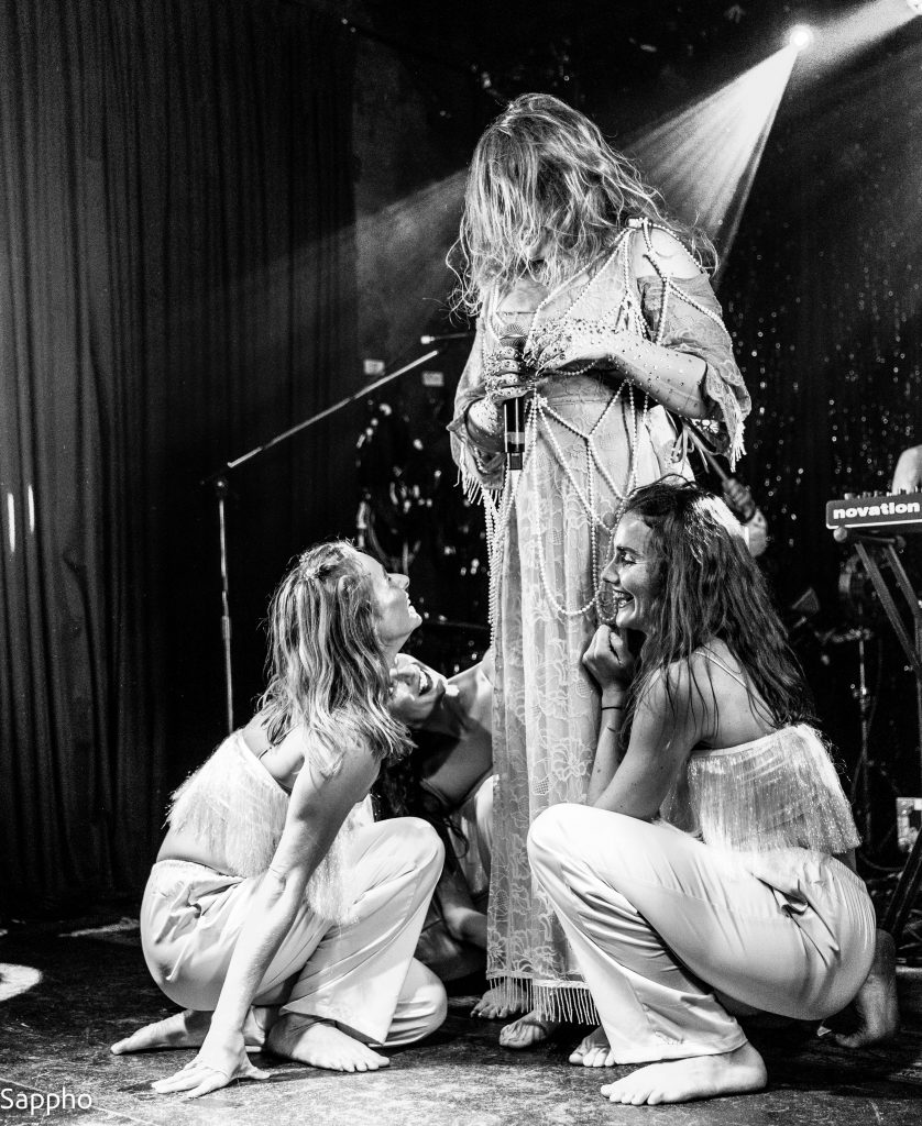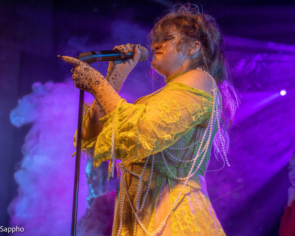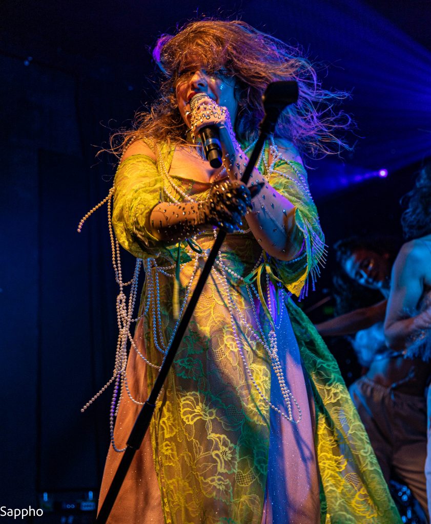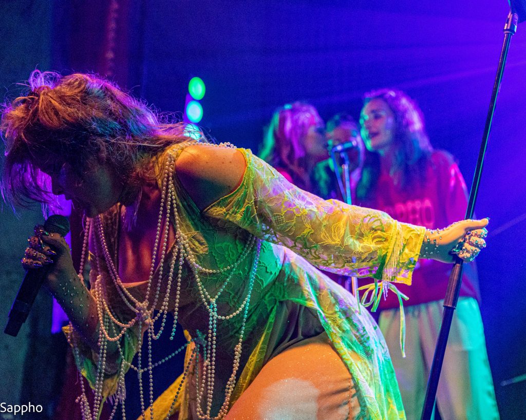 Sappho entranced the audience at the Vanguard with her show last night. Part Kate Bush, part Madonna, she hit the stage with a cover of Jamiroquai’s Cosmic Girl. Backed by four vocalists who also joined in as dancers, it was all swinging pearls and dancing girls as Sappho dazzled the crowd with her funky, upbeat pop.