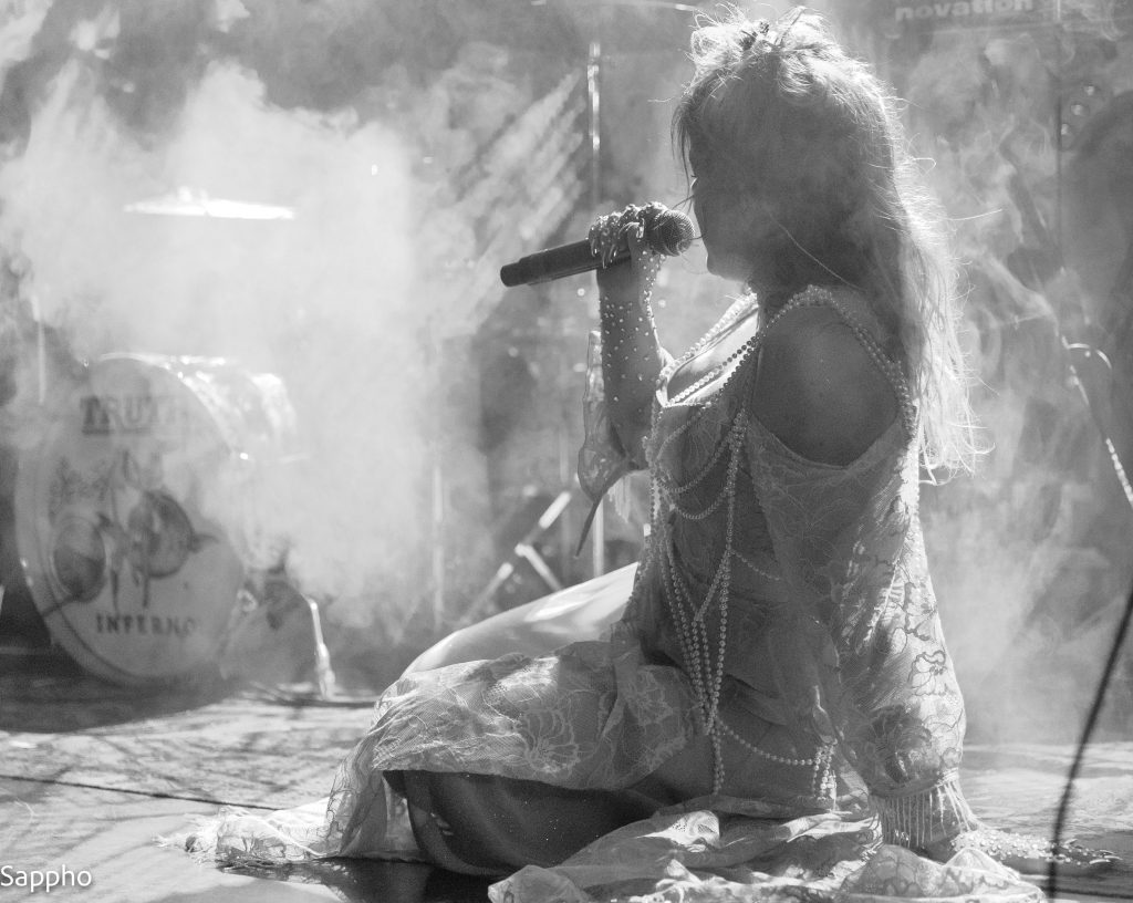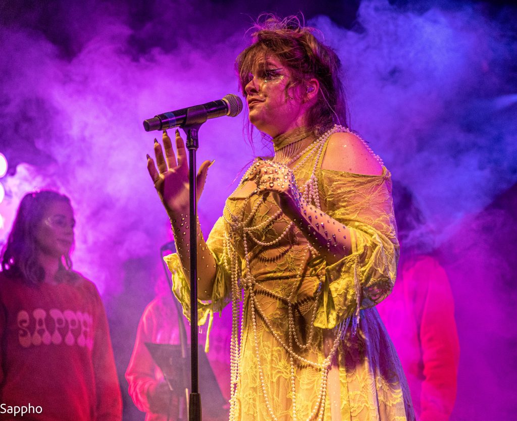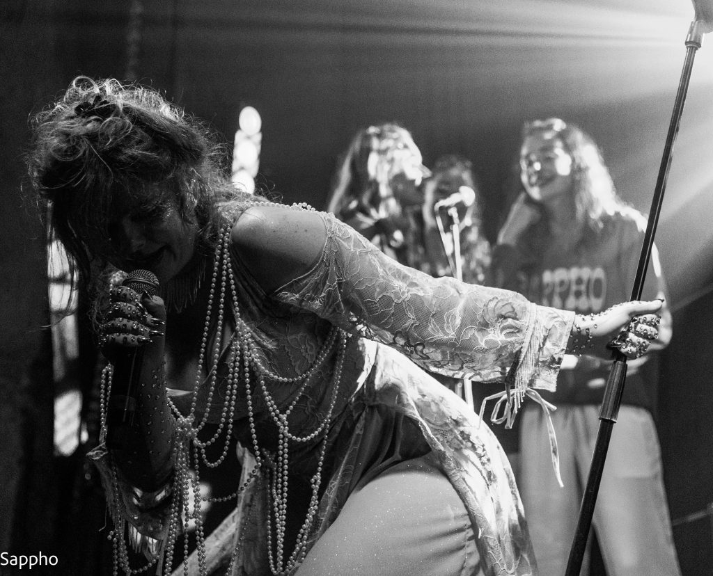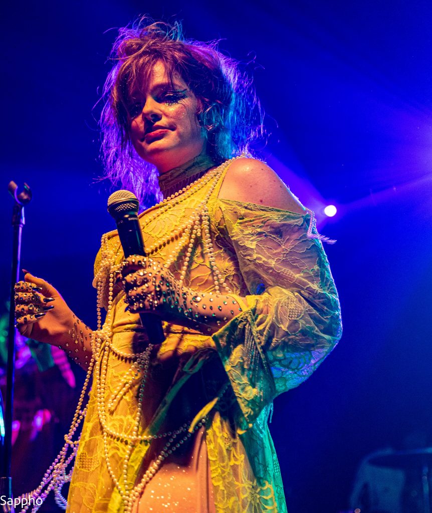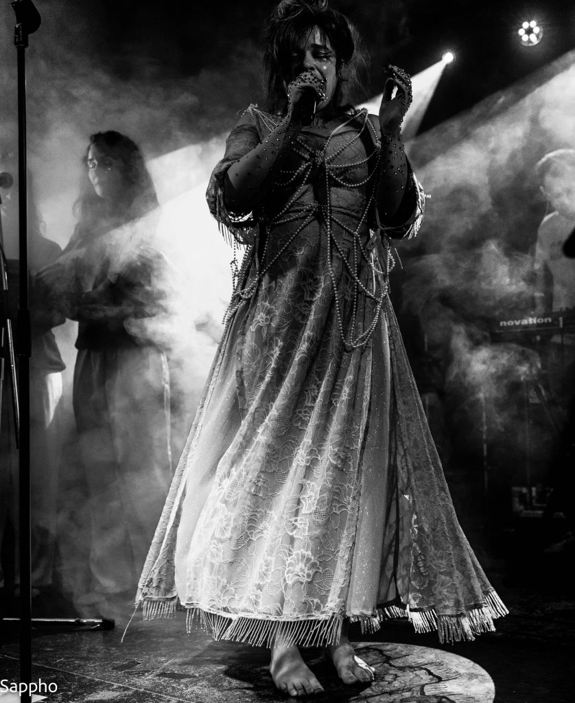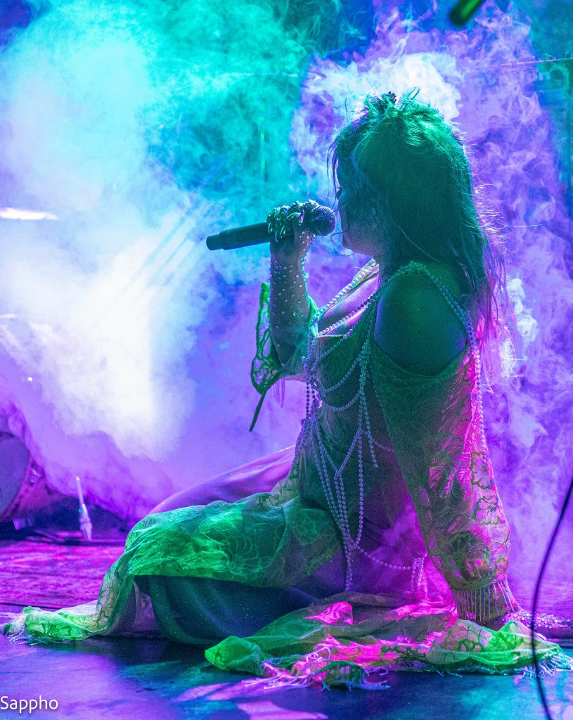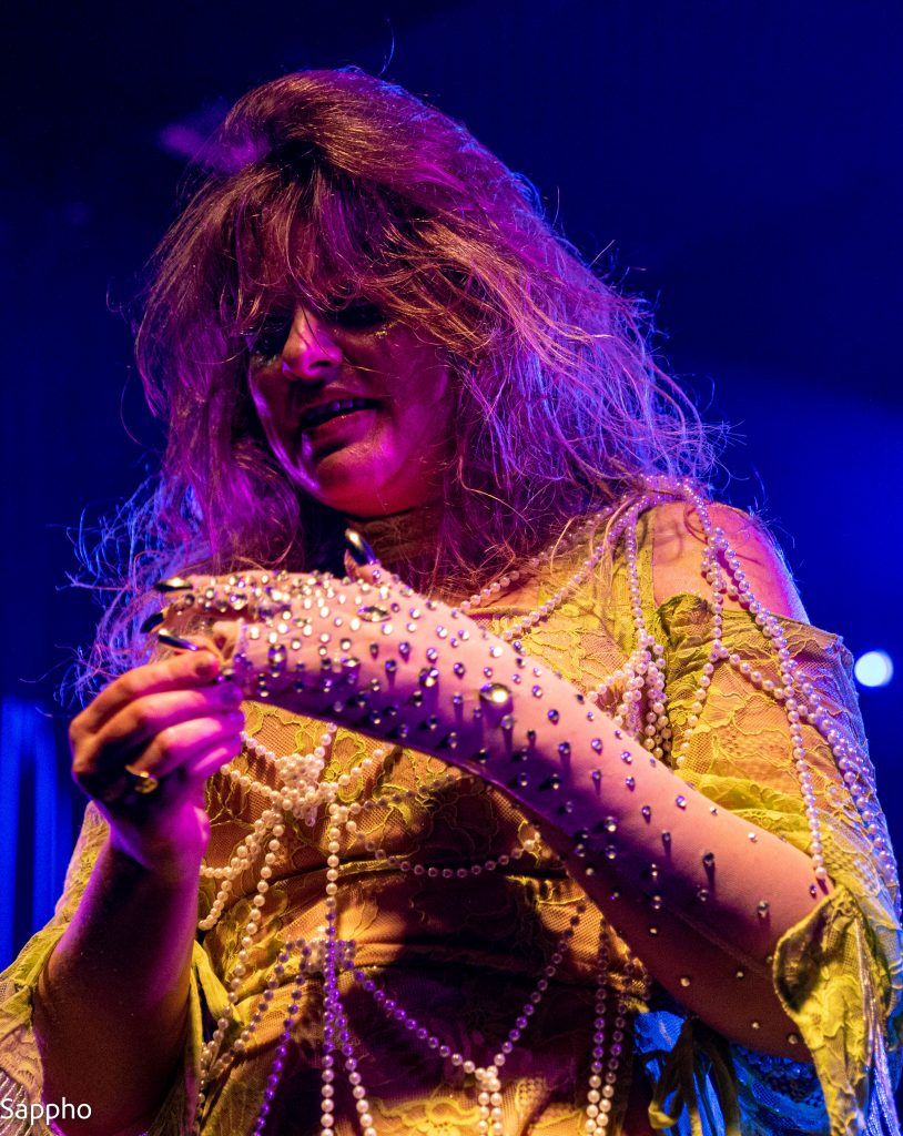 Sappho entranced the audience at the Vanguard with her show last night. Part Kate Bush, part Madonna, she hit the stage with a cover of Jamiroquai’s Cosmic Girl. Backed by four vocalists who also joined in as dancers, it was all swinging pearls and dancing girls as Sappho dazzled the crowd with her funky, upbeat pop.