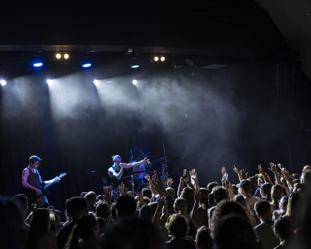 The evening begins with Australian singer Azure, who warms the crowd with a set that leans into soaring vocals and polished alt-pop instincts. The early arrivals press closer to the stage as Azure’s voice fills the room, setting a tone that feels intimate but quietly anticipatory. It’s the calm before the distortion pedals kick in.