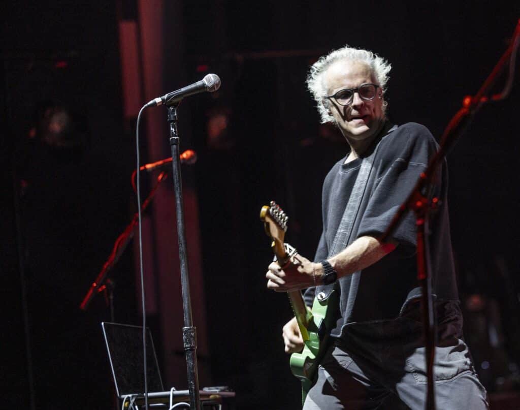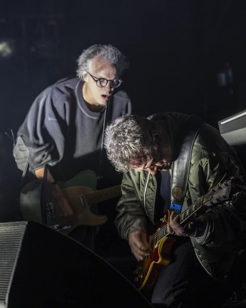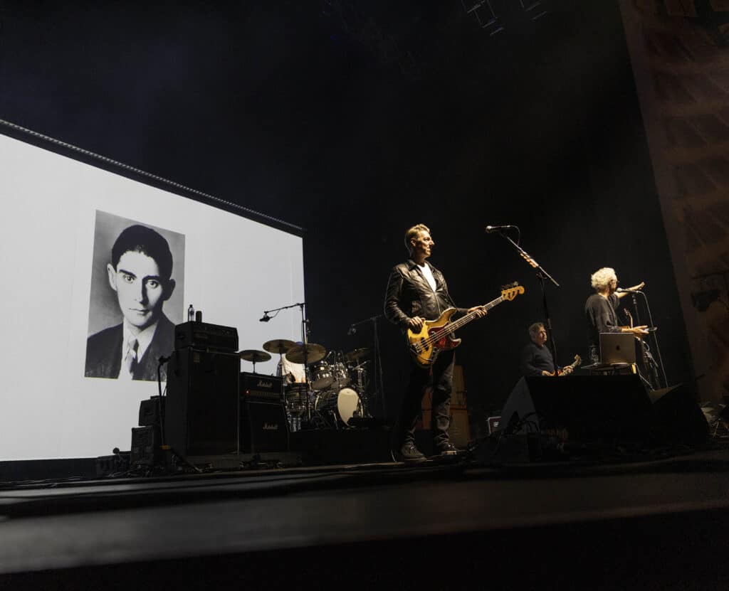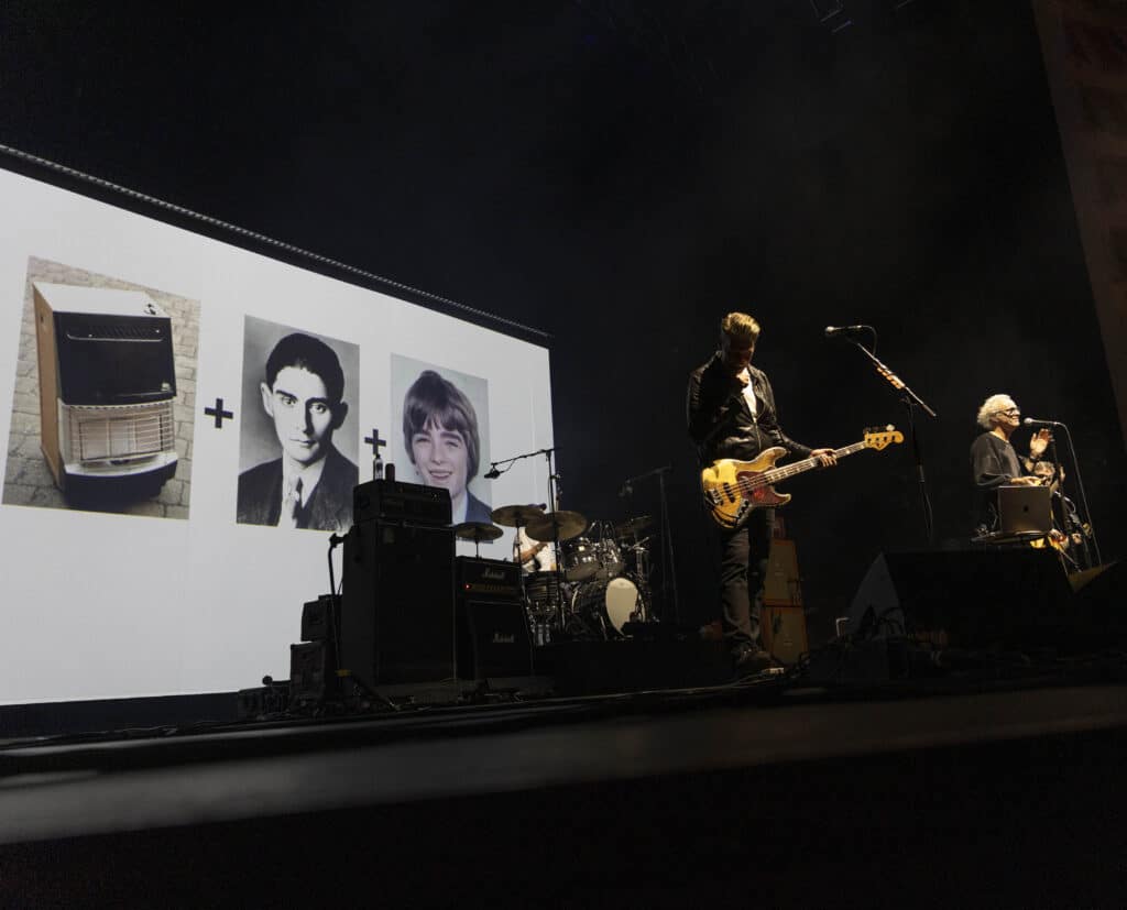 When they take the stage Travis immediately tear into Writing to Reach You, with Andy Dunlop dropping to his knees to wrestle a serrated solo from the guitar, the moment cutting through the theatre’s polish with a welcome rough edge. Fran Healy, hair wild and eyes bright, looks every bit the distracted mad professor as he pauses proceedings to explain that tonight isn’t just a performance but a guided one: a he will flick through a PowerPoint presentation designed to map how these songs came into being. Healy tells us about how, in a freezing Glasgow flat in 1995, he was reading Kafka and listening to Oasis’s Wonderwall when the seeds of Writing to Reach You were formed, behind him a slide featuring a heater, and images of Kafka and Noel Gallagher are projected.