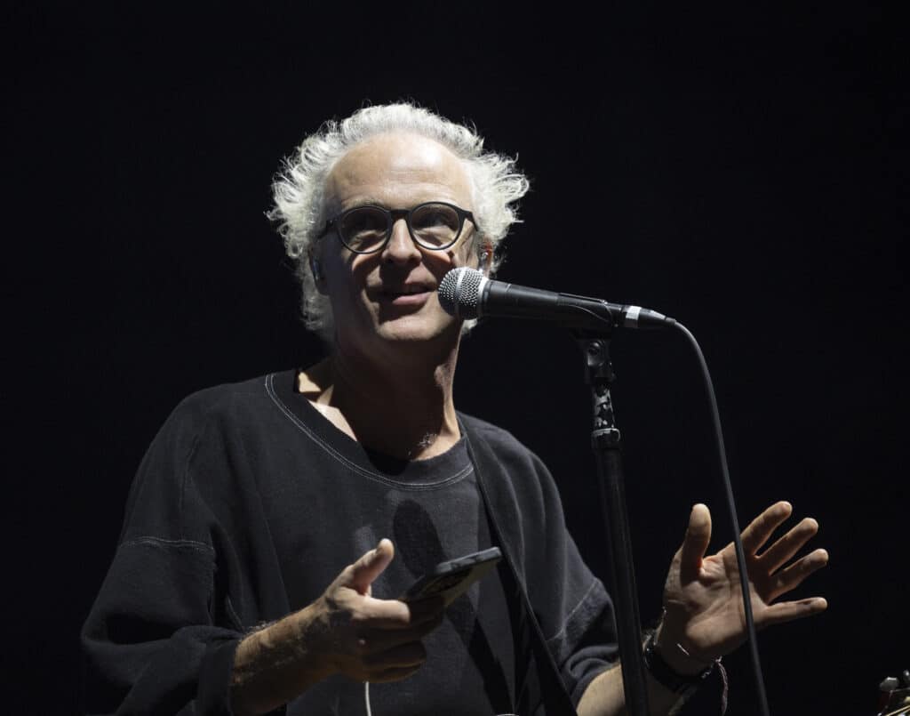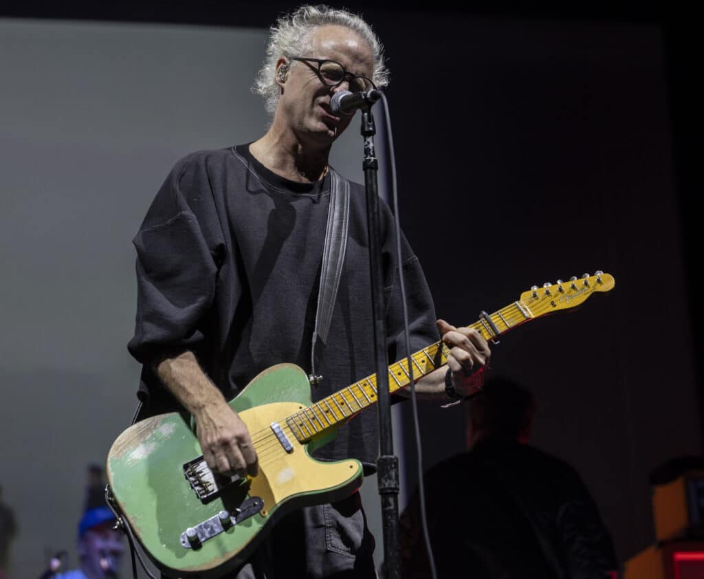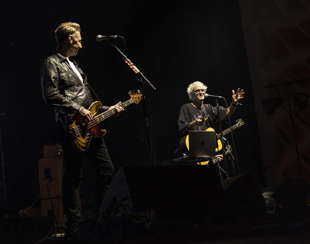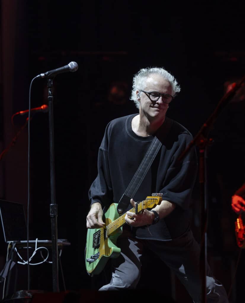 When they take the stage Travis immediately tear into Writing to Reach You, with Andy Dunlop dropping to his knees to wrestle a serrated solo from the guitar, the moment cutting through the theatre’s polish with a welcome rough edge. Fran Healy, hair wild and eyes bright, looks every bit the distracted mad professor as he pauses proceedings to explain that tonight isn’t just a performance but a guided one: a he will flick through a PowerPoint presentation designed to map how these songs came into being. Healy tells us about how, in a freezing Glasgow flat in 1995, he was reading Kafka and listening to Oasis’s Wonderwall when the seeds of Writing to Reach You were formed, behind him a slide featuring a heater, and images of Kafka and Noel Gallagher are projected.
