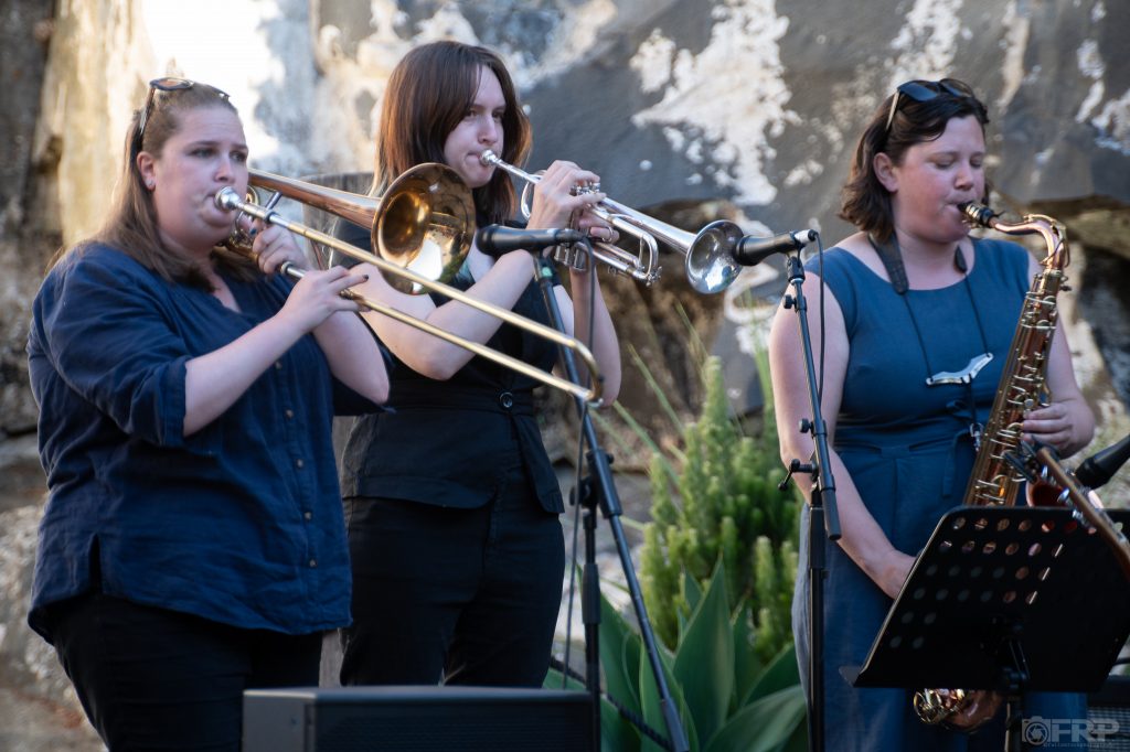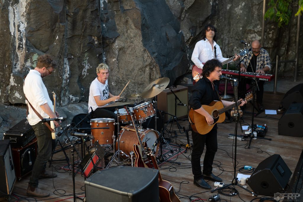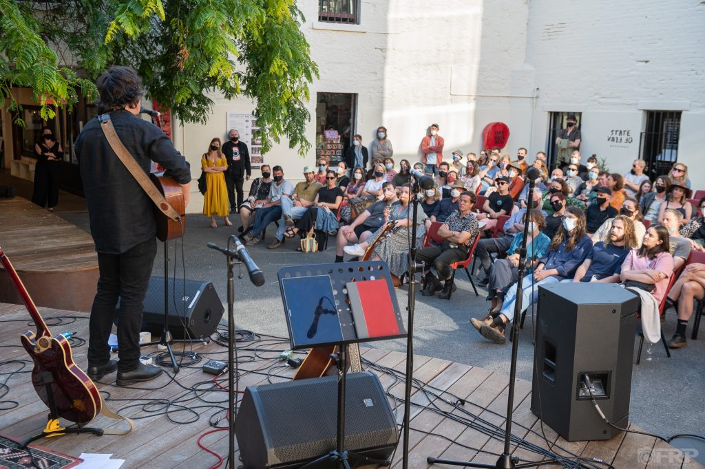 The intimate setting was perfect: behind the stage a sheer and brutal cliff face towering above, the courtyard formed by the cliffs and the rear of the sandstone-hewn former warehouses that used to front the docks of the heritage Salamanca area, framed by an old tree in the corner. This evening, the ceiling was the bright blue sky (an unusual occurrence in itself) and lighting progressively darkening as the light faded late as it does in this region.