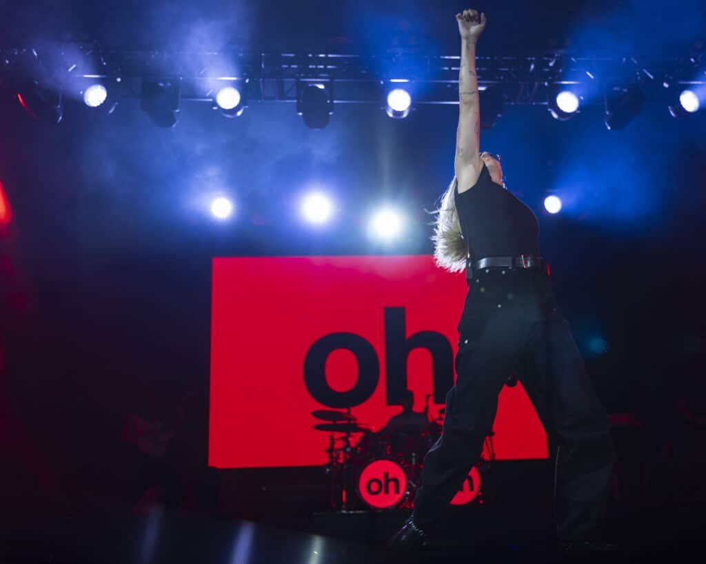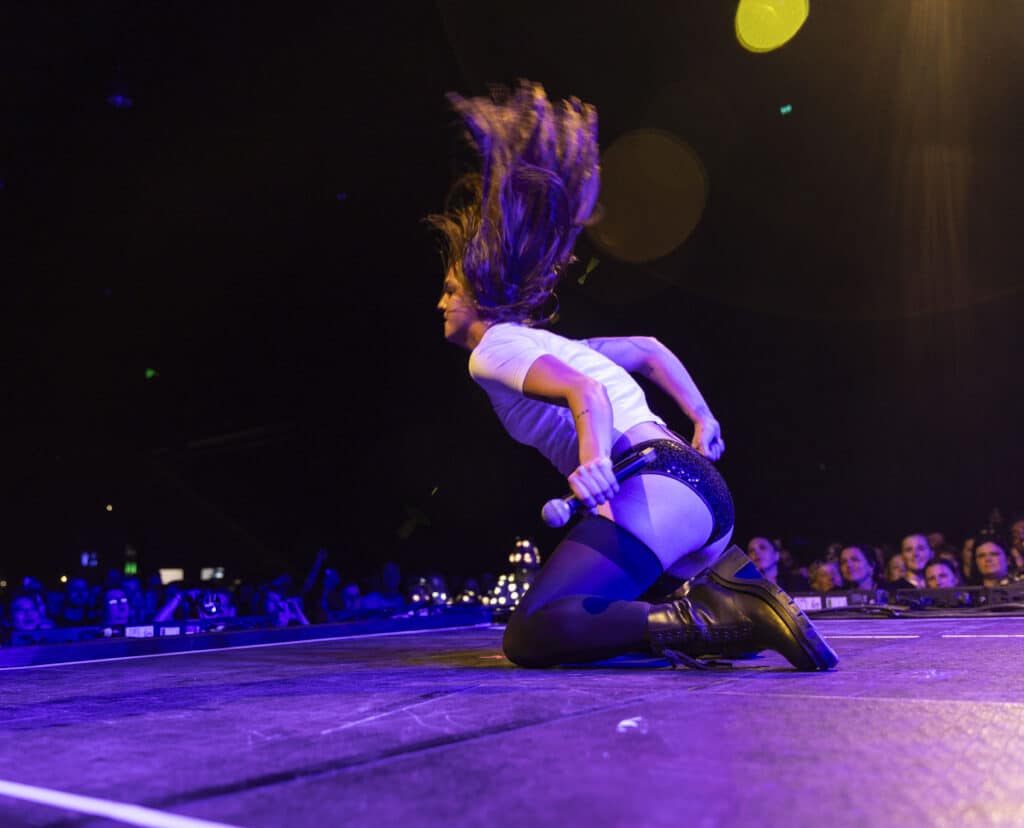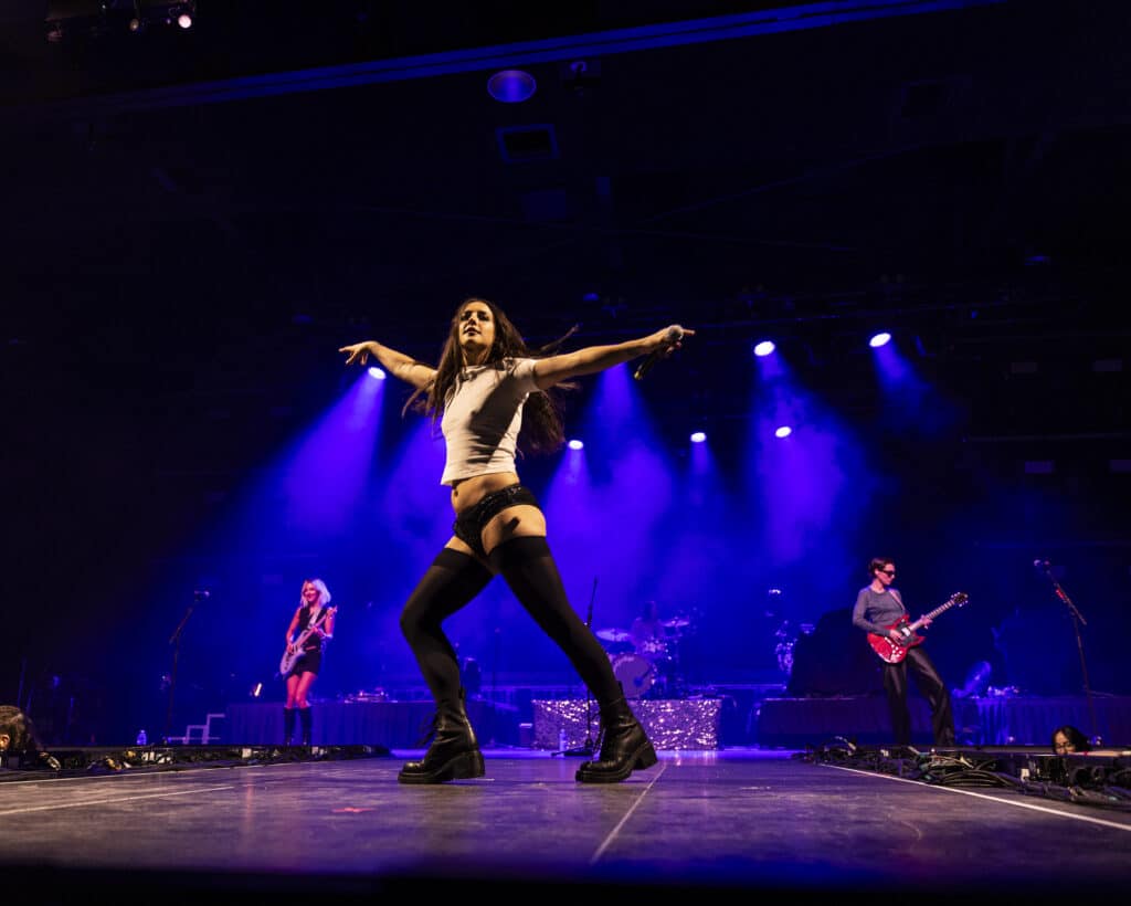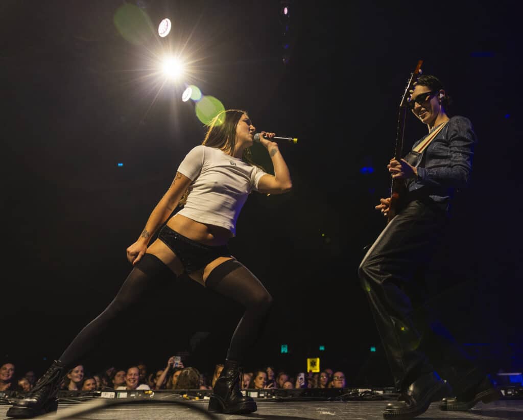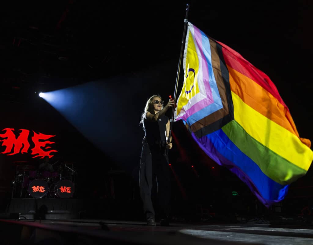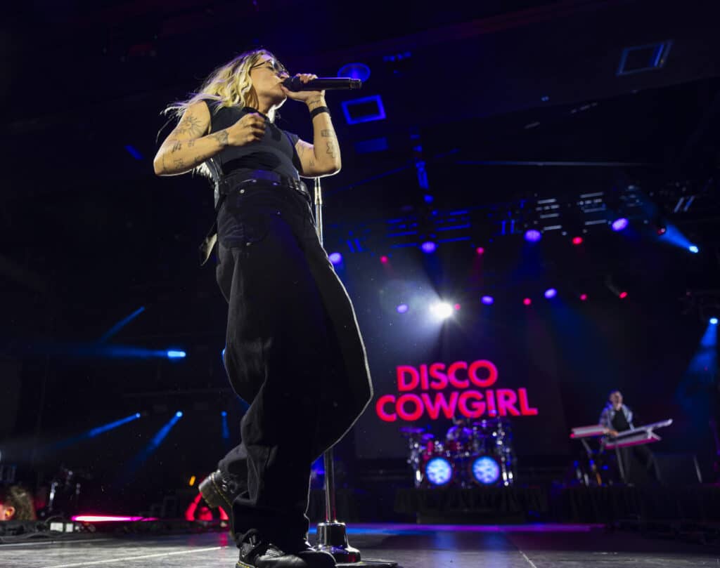 They open with ‘Disco Cowgirl’, the ARIA-nominated single detonating from the first beat, before moving straight into ‘Gay 4 Me’, a vast rainbow flag unfurled and carried across the stage. It’s a confident and deliberate opening, setting both the tone and the intent for the night.
