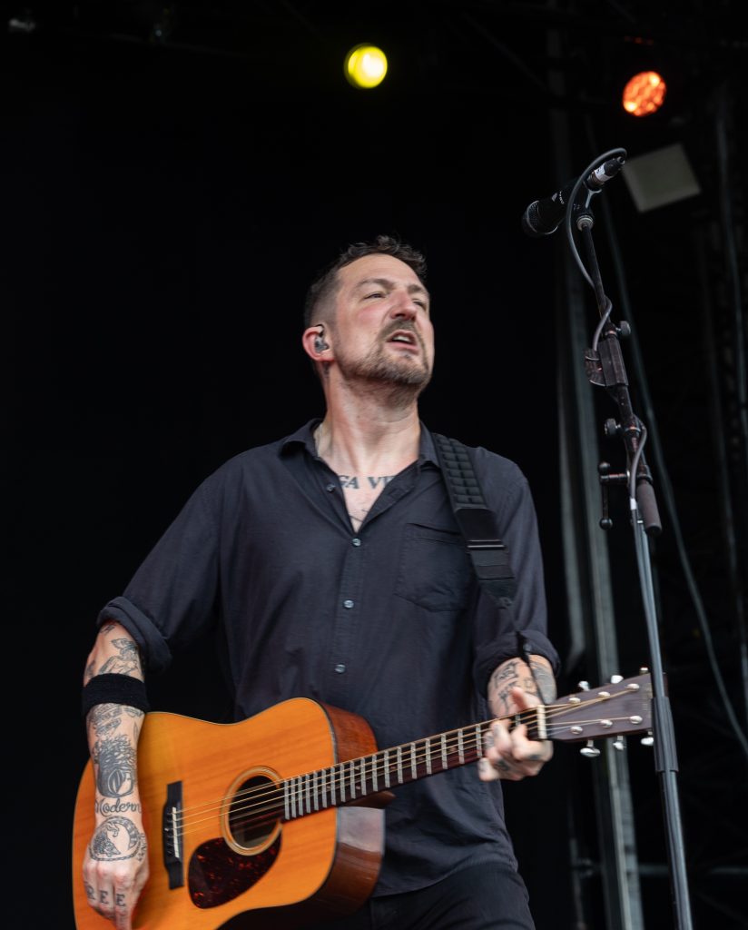 Frank Turner on Stage 3 is pure dynamite. His band is a blur of motion as they rip through anthems that feel like rallying cries for the soaked yet spirited audience.