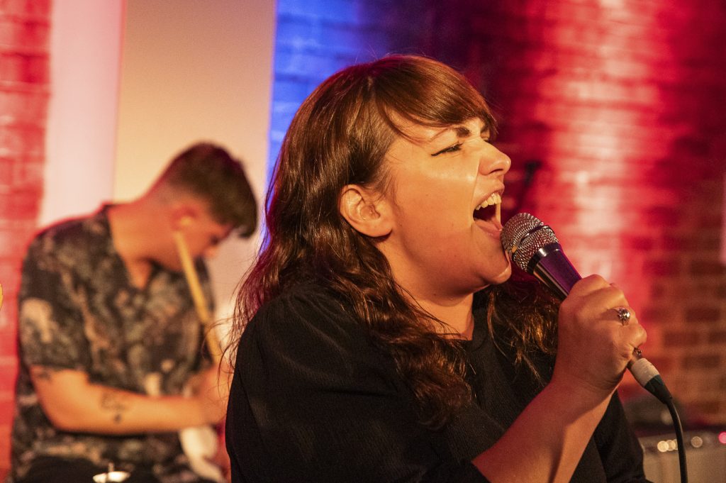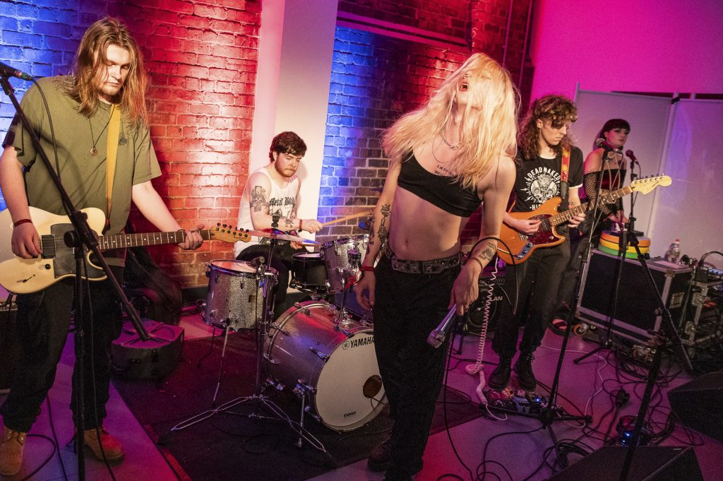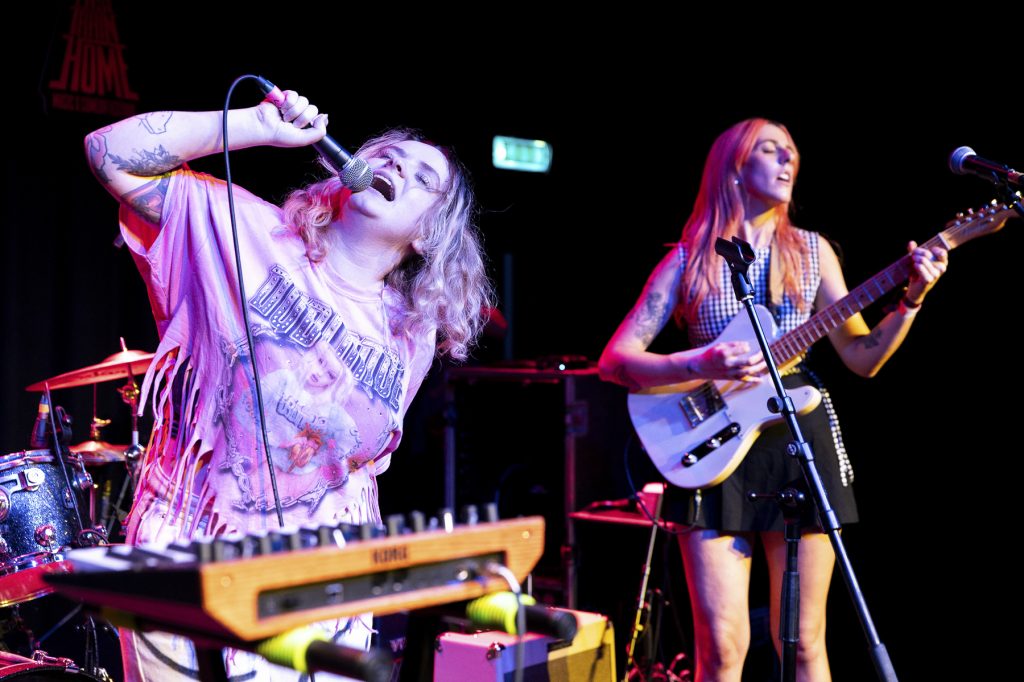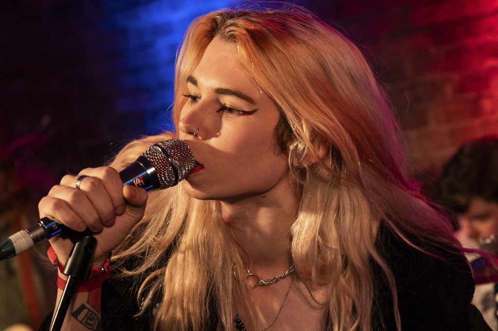 4pm and I witness what, to me, is the first truly great band of the day. Tucked away upstairs in The Hippodrome is the NARC Magazine Stage. A room that, at the most, probably holds 80/100 people. It’s small, hot, sweaty and the perfect setting for Fiona Liquid and The Clique. Before they even begin Liquid is pacing the floor, so much pent-up nervous energy waiting to explode. Add in a band that, amongst others, contains two members of Mally – another North East band with an explosive live show – and you know this is going to be something special. And it is. Like Iggy, Fiona Liquid paces the stage ready to explode. Eyeballing the audience, Liquid not only has a superb voice but an incredible stage presence. And the songs. This is full on, in your face, frantic punk rock reminiscent of the Stooges, first wave punk and the dance influence of people such as LCD Soundsystem. The guitars slice through you, the drums pummel you, the keys are subtle but add wonderfully to the mix. And all the while there’s this presence completely unable to stay still. Liquid is in the crowd, leaping around, preening in front of the mirrored wall. Songs full of anger, sadness and raw feelings. There’s no holding back as they spit venom addressing attitudes towards those that refuse to conform to outdated beliefs. There’s harshness here along with darkness but there’s also joy in the way you want to join in, leap around and make the absolute most of what you’re witnessing. Fiona Liquid and The Clique say it how it needs to be said and do so over a sonic assault with a visual spectacle that no one who appreciates music with a real attitude should ignore. Brilliant.