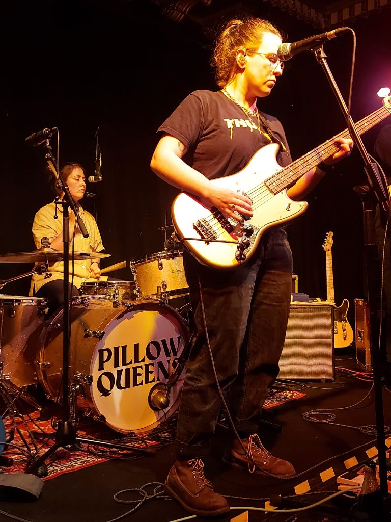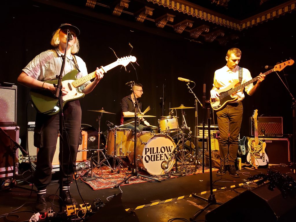 The support band were Glasgow’s Teose, a 3-piece were who clearly delighted to be onstage supporting Pillow Queens. A trio comprising a drummer and two guitarists their sound was a combination of garage guitars, a thumping bass and a drummer who couldn’t stop smiling. Half way through their set the lead singer had to replace her guitar string but the improvisation by the other two kept the audience throughly entertained. It felt seamless and the crowd were fully appreciative. The guitars were sharp and smooth when required and the shift in pace midtrack showed a real confidence to mix up the pace. By the end of the 30 minute set the crowd were converted to Tesose.