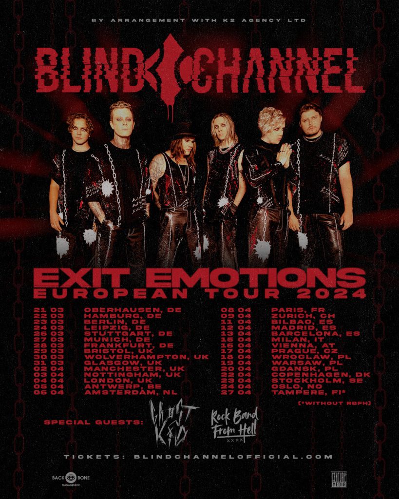 With news of the new album, BLIND CHANNEL have also announced some massive tour plans for the remainder of 2023 and next year – none more urgent than the band’s own Exit Emotions European headlining tour for Spring 2024. The 30-city trek will include six UK headline dates starting in Bristol on 29th March and ending in London on 4th April. Joining the band on this run as direct support is GHØSTKID.