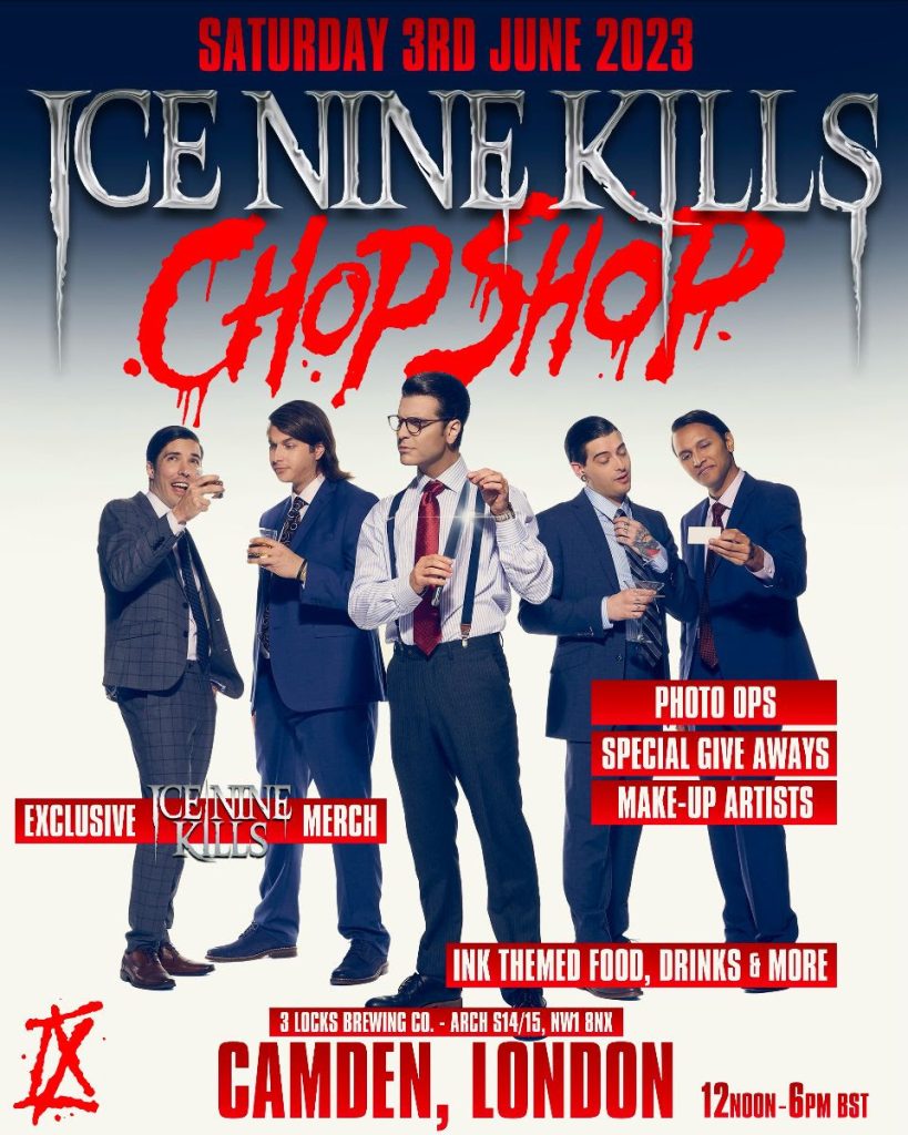 The body count continues to rise as the overlords of slashercore, ICE NINE KILLS, announce the arrival of their pop up Chop Shop. The event, which includes exclusive merchandise, make-up artists, themed food and drinks, and more, will take place on Saturday 3rd June in 3 Locks Brewing Company, Camden, London, from 12pm-6pm with free entry. Fans are encouraged to embrace their inner psycho and dress up for the occasion.