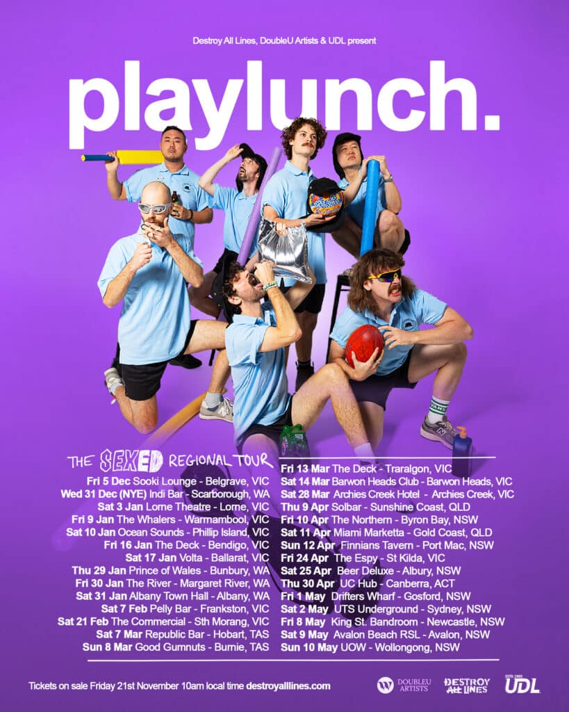 Playlunch will take their Sex Ed Regional Tour across Australia from December through to May, marking their biggest run of shows to date and extending the momentum they’ve built across 2024 and 2025. The Melbourne bogan-funk outfit — forged during lockdown in a makeshift home-studio in Melbourne’s eastern suburbs — began as the chaotic, genre-bending project of producer and multi-instrumentalist Liam Bell. Blending retro dance music, Aussie late-‘90s/early-2000s nostalgia and unapologetic suburban humour, Playlunch have spent the past two years shaping their own lane: Bogan Funk.
