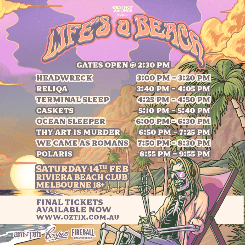 Curated and headlined by Polaris themselves, Life’s A Beach brings together a mixed bill of Australian and international heavy acts, including We Came As Romans, Thy Art Is Murder, Ocean Sleeper, Caskets, Terminal Sleep, Reliqa and Headwreck. Rather than a standard touring stop, the event reframes heavy music within an outdoor, beachside setting, marking a change of pace from enclosed rooms and late-night load-outs.