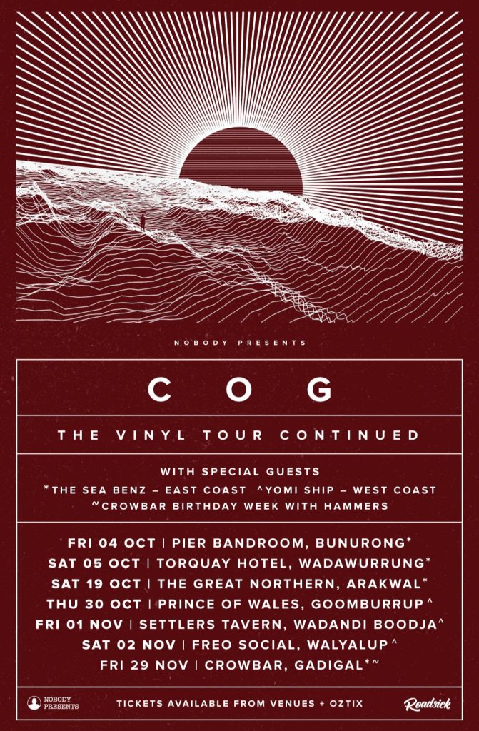 After their East Coast run earlier this year, Cog will be continuing their The Vinyl Tour, and will visit regional Victoria, New South Wales, and Western Australia this October and November. They will also be making a special appearance for Crowbar Sydney’s birthday week.